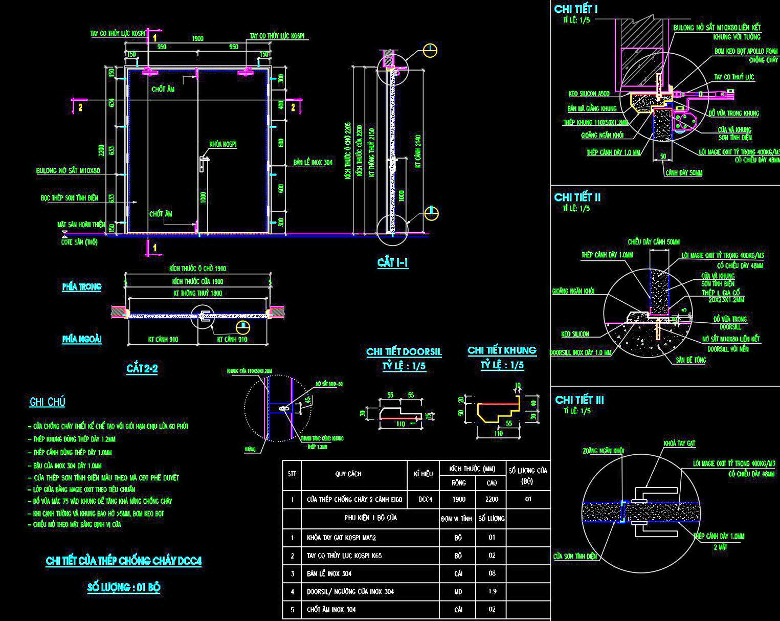 Ứng dụng thực tế của sản phẩm này bao gồm thi công các công trình xây dựng cần tiêu chuẩn phòng cháy chữa cháy, đảm bảo an toàn cho người sử dụng. Cửa được bọc thép sơn tĩnh điện, tạo độ bền và khả năng chịu nhiệt tốt. Kích thước và chi tiết kỹ thuật được minh họa trong bản vẽ bao gồm chiều cao tổng thể là 2200 mm, chiều rộng cánh là 1900 mm, với chốt âm và khóa KOSPI hiện đại.