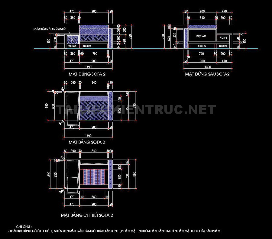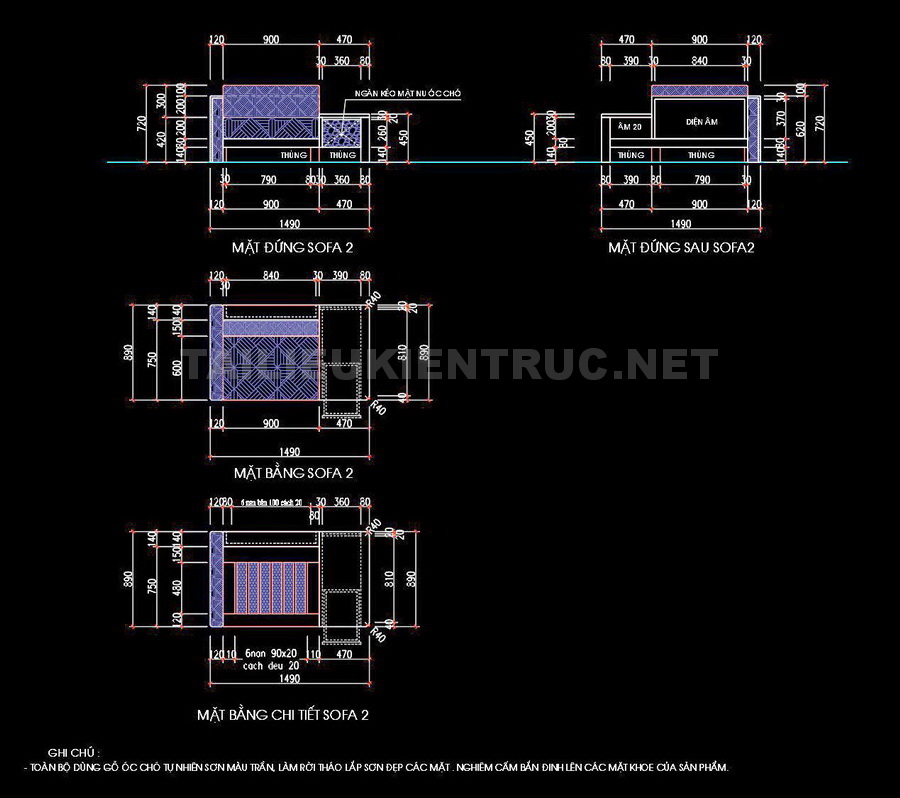 Bản vẽ chi tiết thể hiện cấu trúc của một chiếc sofa với các góc nhìn từ mặt đứng, mặt bằng, và mặt cắt chi tiết. Tài liệu này không chỉ cung cấp những cái nhìn sâu sắc về thiết kế mà còn giúp người sử dụng dễ dàng hình dung và đánh giá sản phẩm trước khi đưa vào sản xuất hoặc thi công.