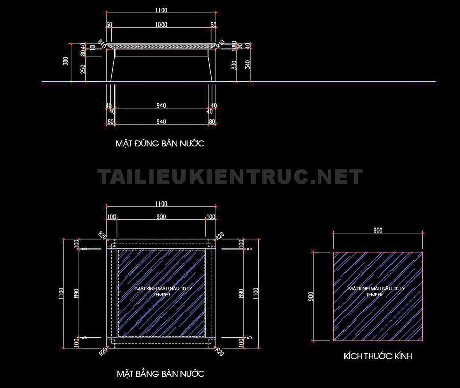- Bao gồm mặt đứng bản nước, mặt bằng bản nước và kích thước kính.