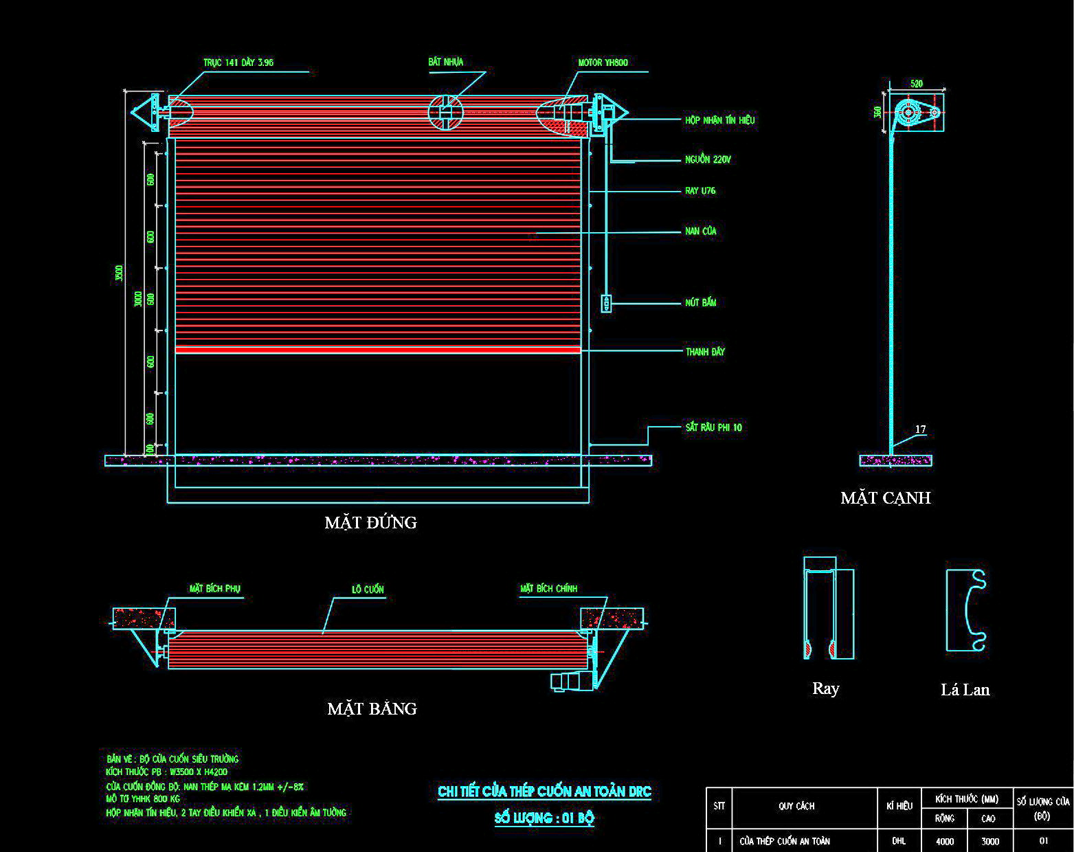 Hình ảnh mô tả cụ thể về các phần chính của cửa cuốn bao gồm mặt đứng, mặt bằng và mặt cắt cạnh. Cửa cuốn sử dụng trục 141 dày 3.96, có kèm theo motor YH800 và hộp nhận tín hiệu thông qua nguồn điện 220V. Thiết kế này không chỉ đảm bảo tính thẩm mỹ mà còn tối ưu hóa về mặt kỹ thuật.