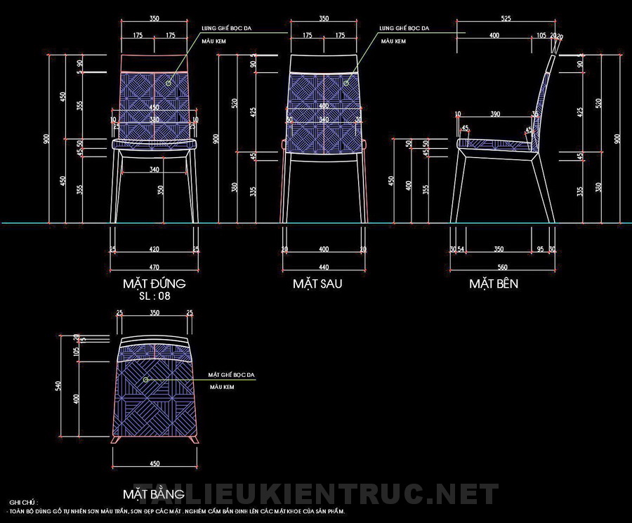 Hình ảnh trong tài liệu cho thấy thiết kế chi tiết của một chiếc ghế với các góc nhìn khác nhau như mặt trước, mặt sau, mặt bên và mặt phẳng. Kích thước cụ thể được trình bày rõ ràng trên từng góc nhìn, giúp người dùng có cái nhìn tổng quan và chính xác về sản phẩm.