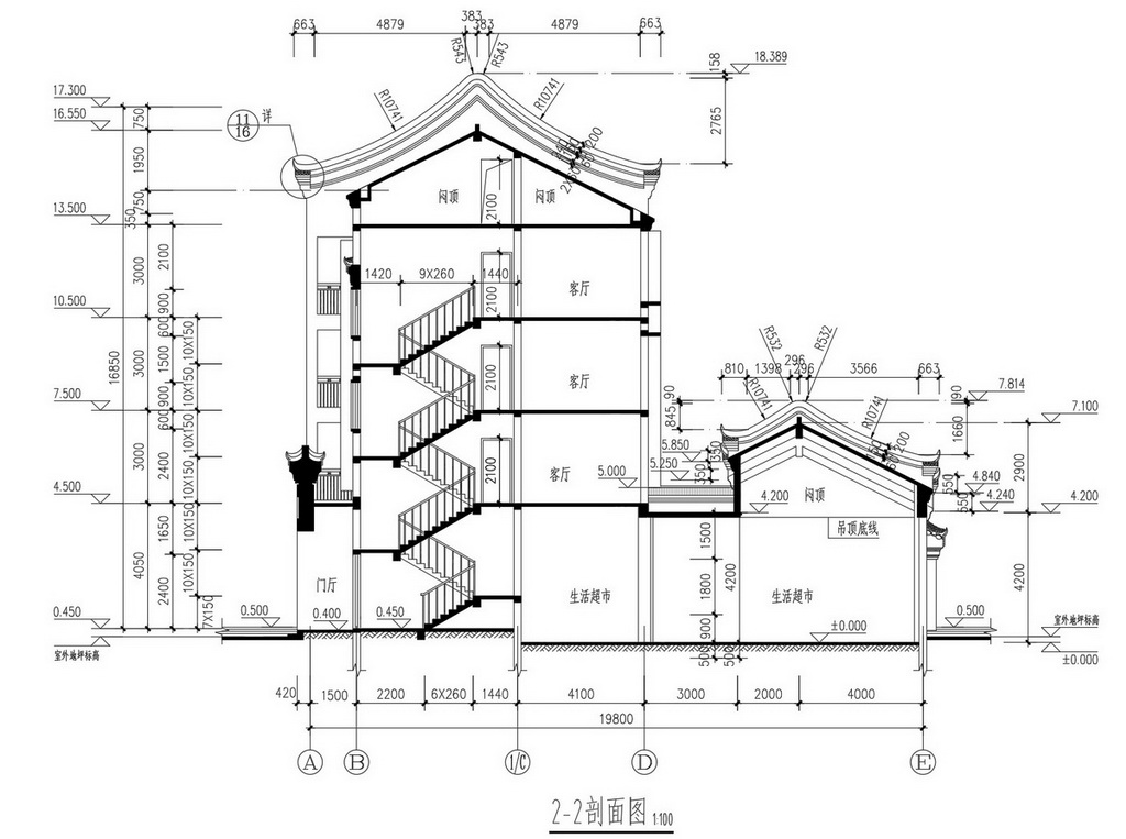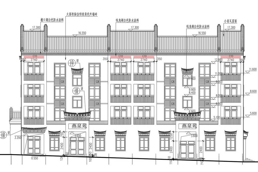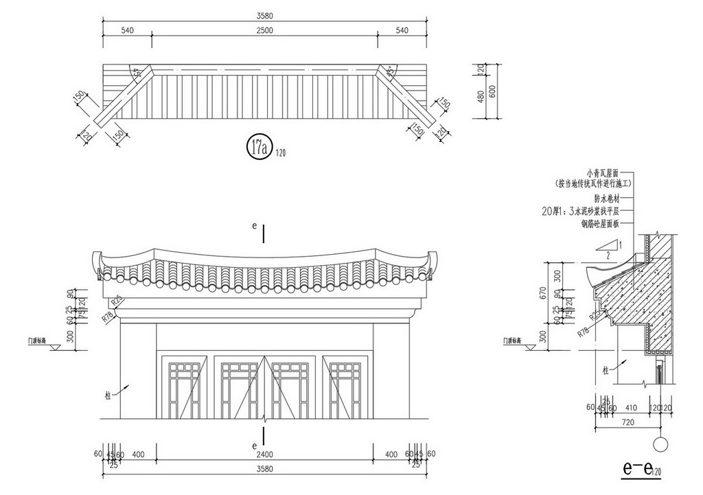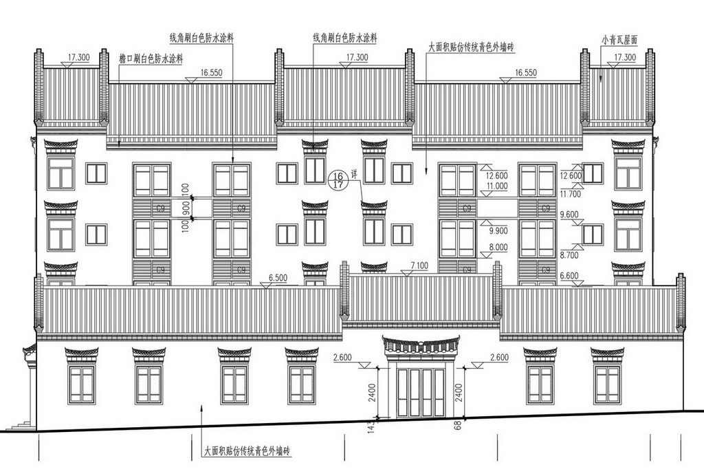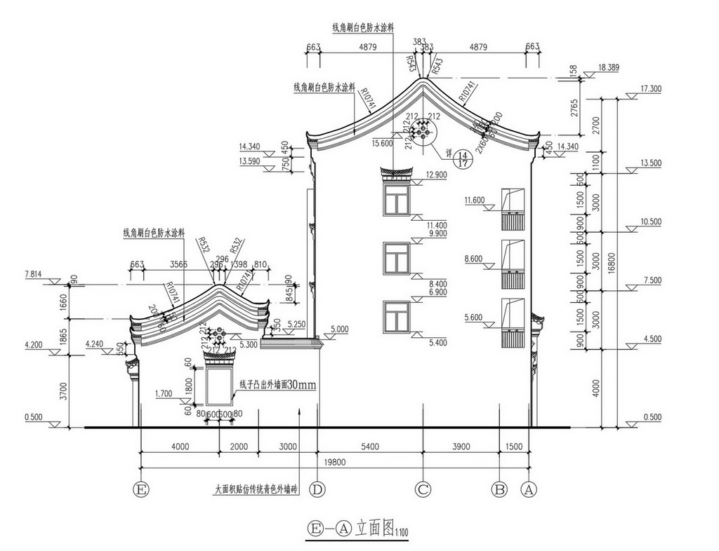 Tài liệu này bao gồm hình ảnh chi tiết mặt đứng và mặt bên của công trình, thể hiện rõ cấu trúc phong cách truyền thống với các đường nét đặc trưng của kiến trúc Trung Hoa. Bản vẽ được trình bày một cách chuyên nghiệp với các thông số kích thước và chi tiết cụ thể, thuận tiện cho các kỹ sư kiến trúc tham khảo.