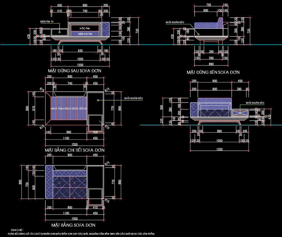 Nội dung tài liệu bao gồm các bản vẽ mặt bằng, mặt đứng và chi tiết của sofa đơn. Các hình ảnh cho thấy rõ kích thước, cấu trúc và các thành phần của sản phẩm, cung cấp cái nhìn tổng quan về thiết kế và cách thức thi công.