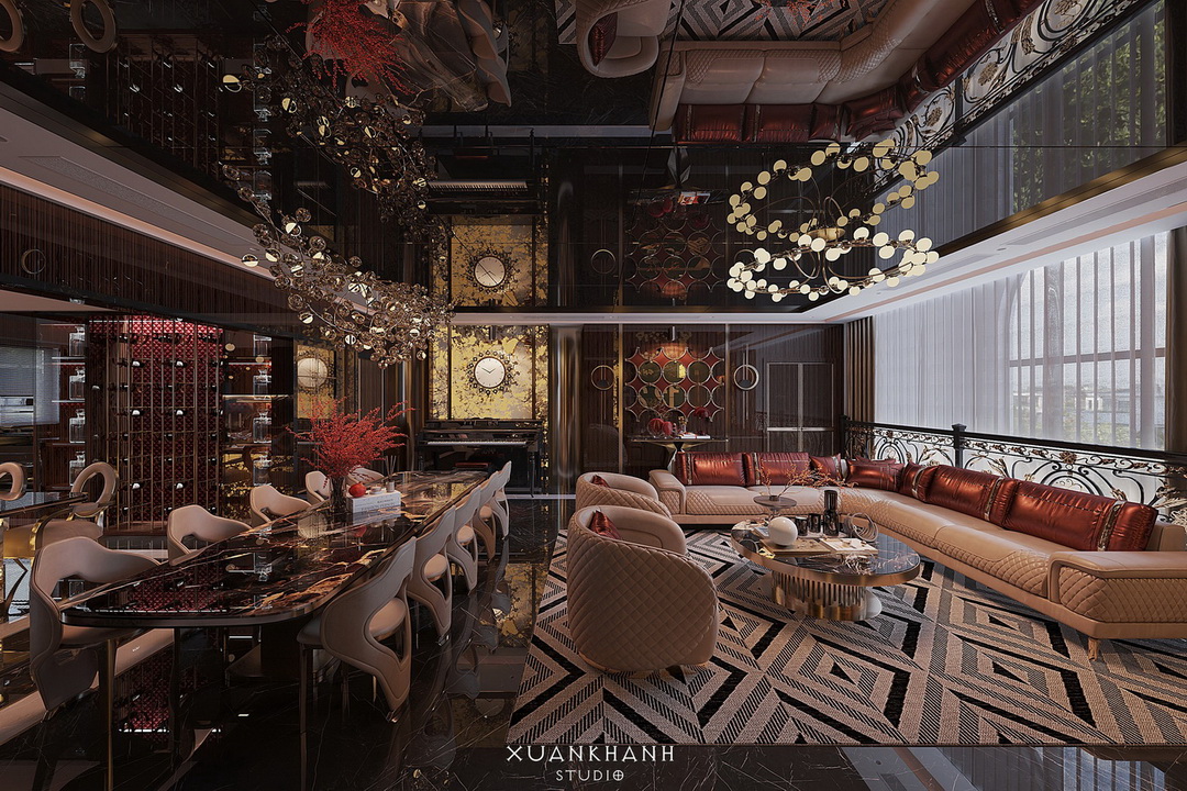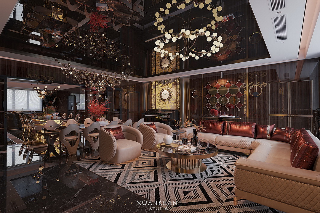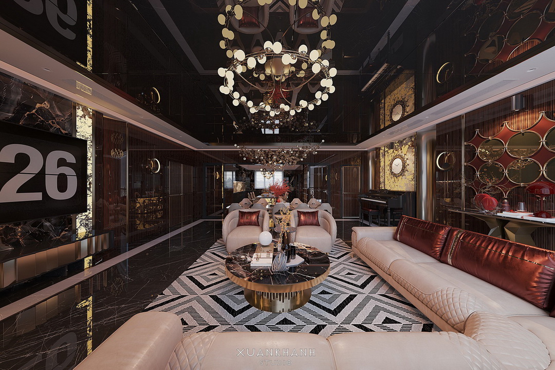 Trong các hình ảnh được cung cấp, không gian được bài trí với màu sắc ấm áp và tinh tế, từ sự kết hợp giữa ánh sáng vàng của đèn chùm và tông màu nâu trầm của nội thất gỗ. Các ghế sofa lớn với đệm da sang trọng, bàn trà kính cùng tấm thảm trải sàn họa tiết làm nổi bật phong cách đương đại mà không kém phần ấm cúng.