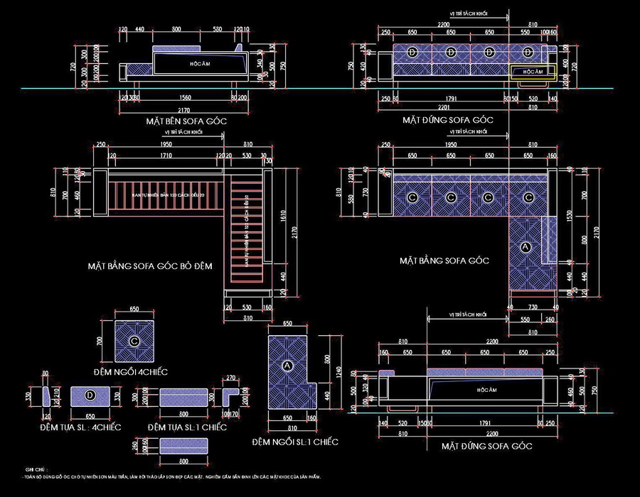 - Bản vẽ bao gồm các mặt cắt và kích thước chi tiết của ghế sofa góc và các thành phần đệm.