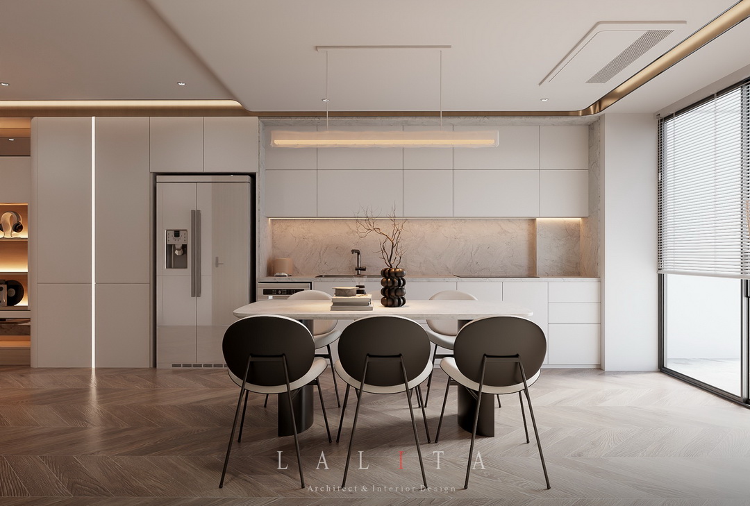 Không gian bếp nổi bật với bộ bàn ăn trang nhã, ghế ngồi kiểu dáng hiện đại kết hợp hài hòa với tủ bếp trắng bóng và quầy bar nhỏ. Bề mặt tủ bếp ốp đá hoa cương tinh tế, mang lại vẻ đẹp lâu bền và sang trọng. Cửa kính lớn giúp tận dụng ánh sáng tự nhiên, đồng thời kết nối với không gian bên ngoài, mang lại cảm giác gần gũi với thiên nhiên.