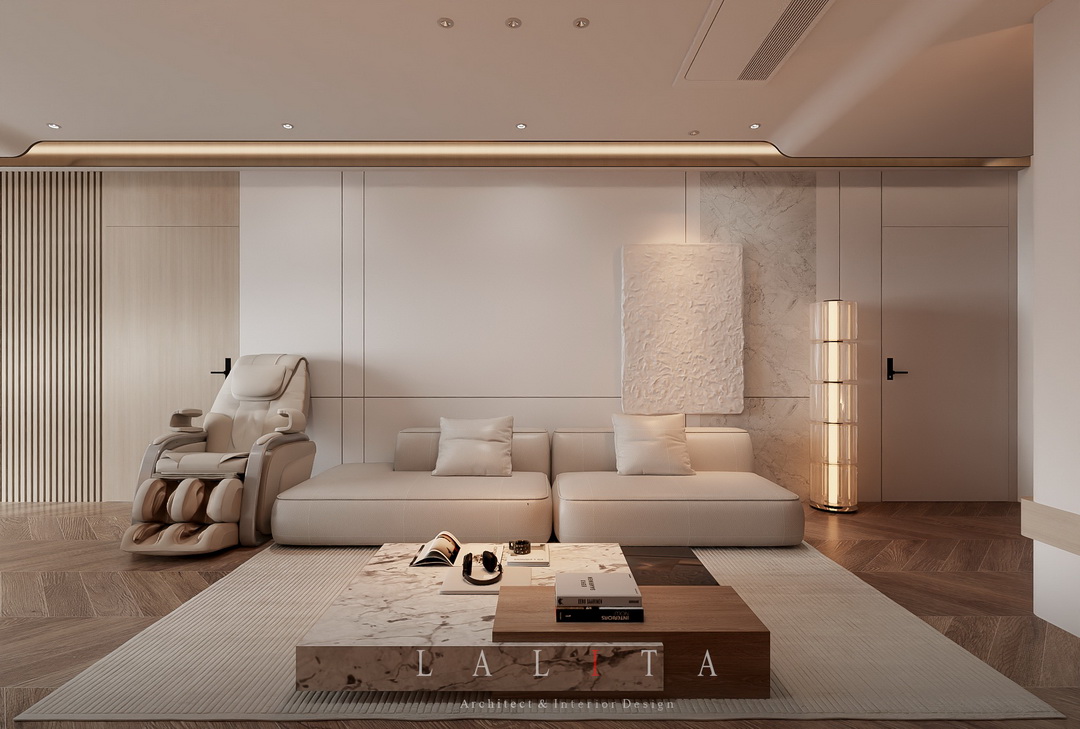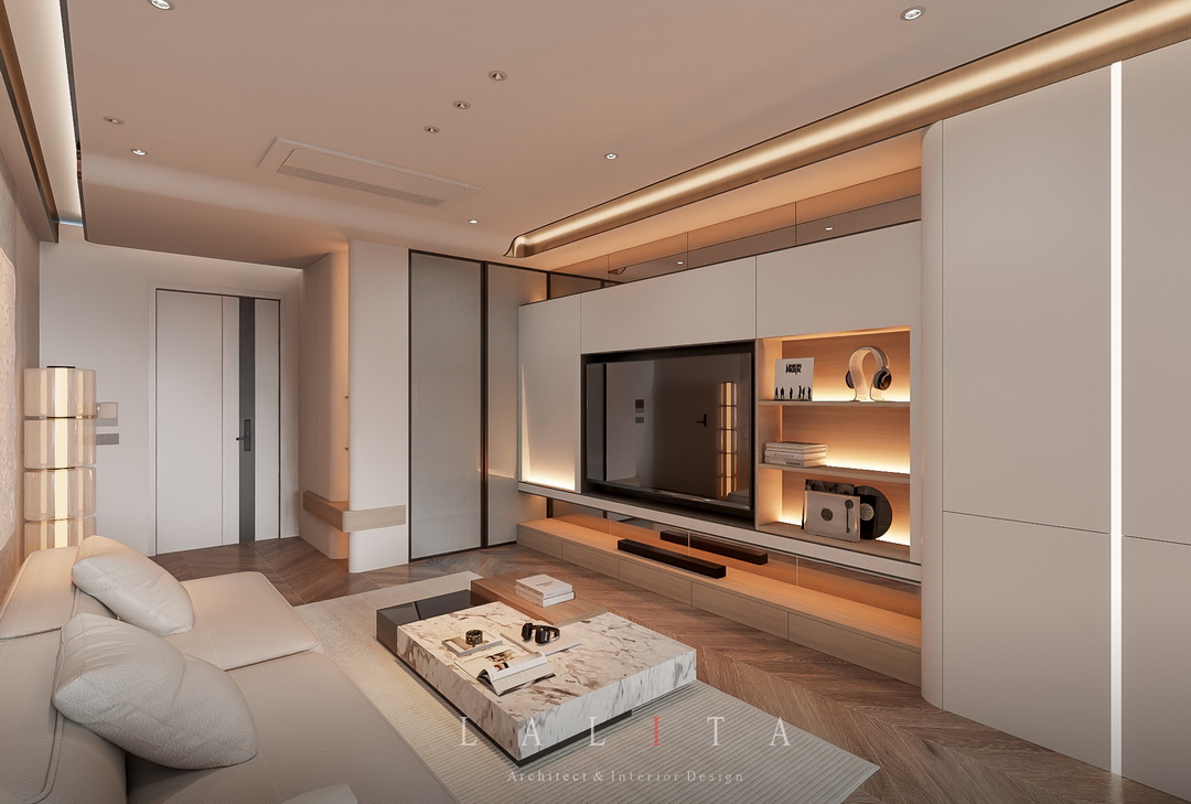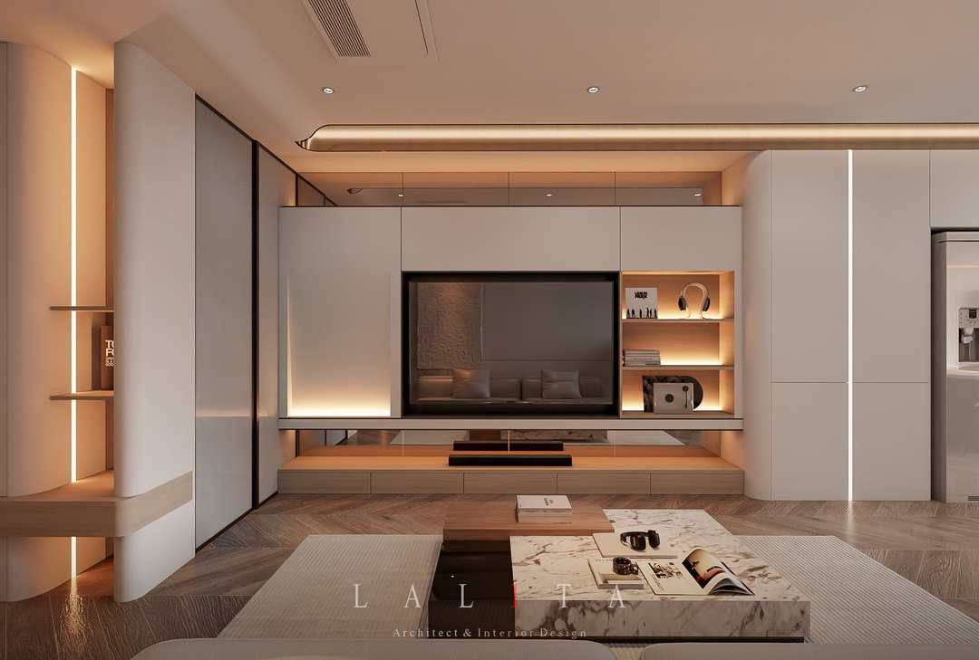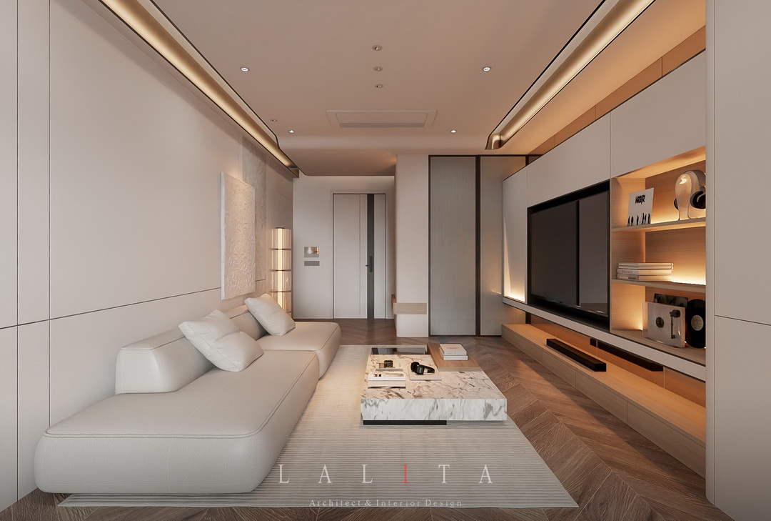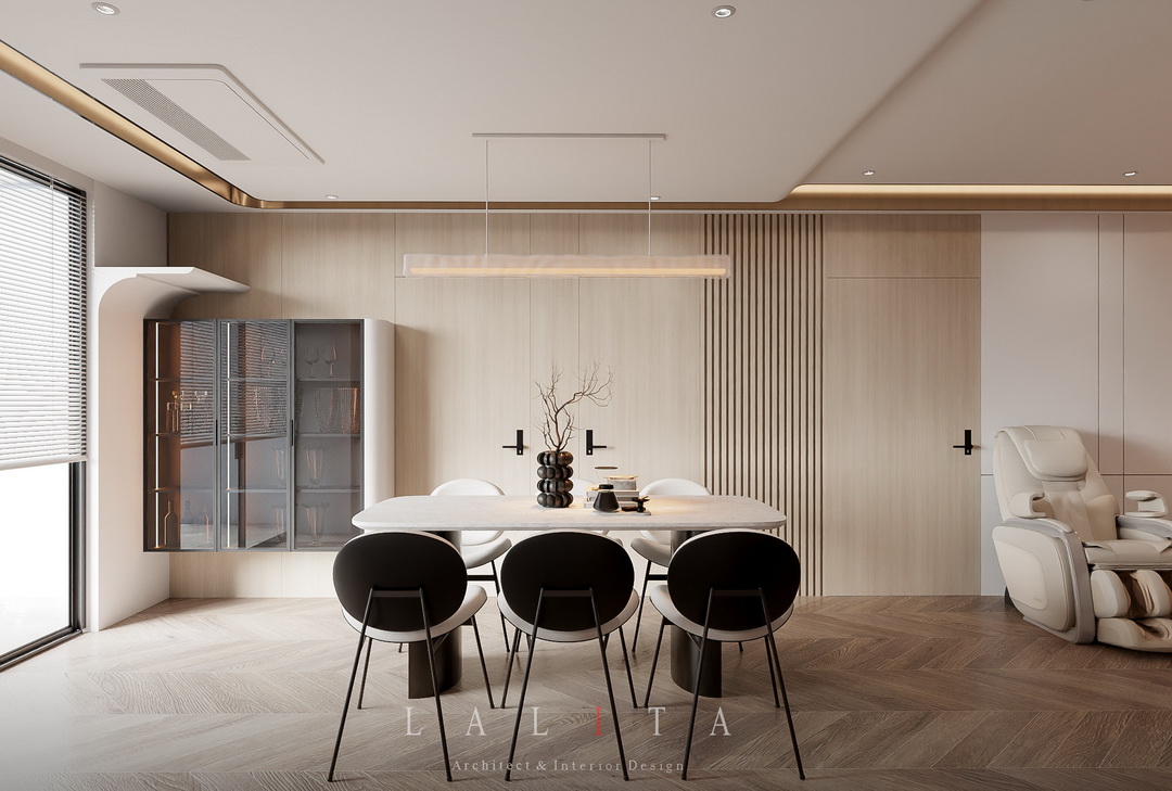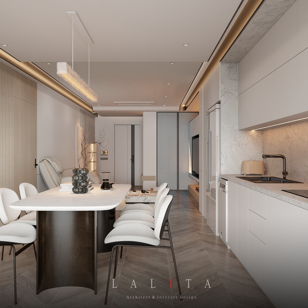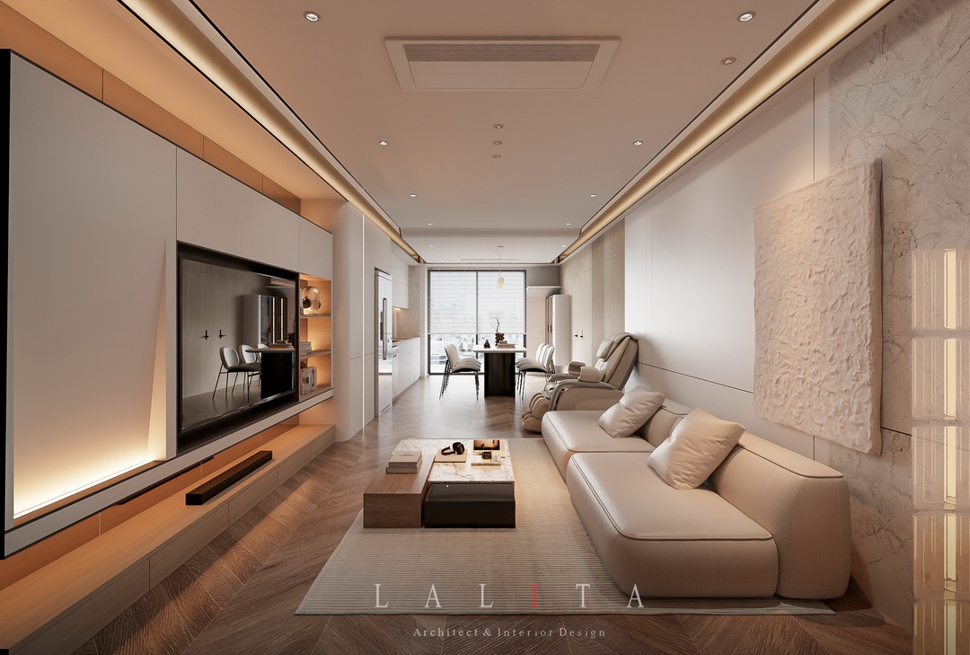Phòng khách và bếp ăn được thiết kế mở, tạo cảm giác rộng rãi và thông thoáng. Tông màu chủ đạo là trắng và mộc, tạo ra một không gian ấm cúng và dễ chịu. Hệ thống ánh sáng được bố trí khéo léo với các đèn LED âm trần và dải đèn chạy dọc, mang lại ánh sáng nhẹ nhàng và tự nhiên.