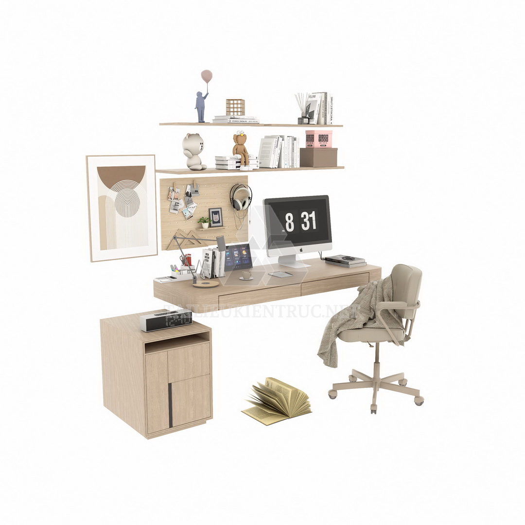 Bàn làm việc với màn hình máy tính lớn, lịch kỹ thuật số, cùng các kệ chứa đồ sắp xếp ngăn nắp, cung cấp một không gian lý tưởng cho công việc, học tập, và sáng tạo. Các ngăn kéo bên dưới bàn và tủ phụ nhỏ cung cấp thêm không gian lưu trữ cho tài liệu và vật dụng cá nhân.