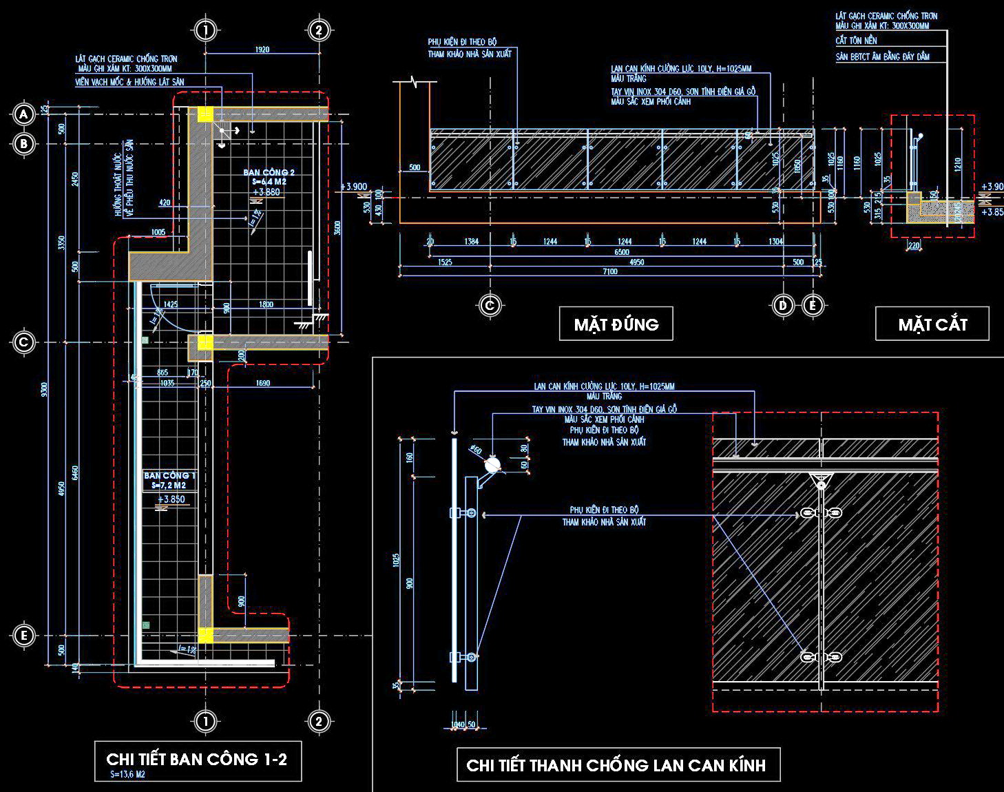 Tài liệu này cung cấp một cái nhìn chi tiết về thiết kế ban công với lan can kính và sắt, hoàn toàn tương thích với nhiều yêu cầu kiến trúc hiện đại.