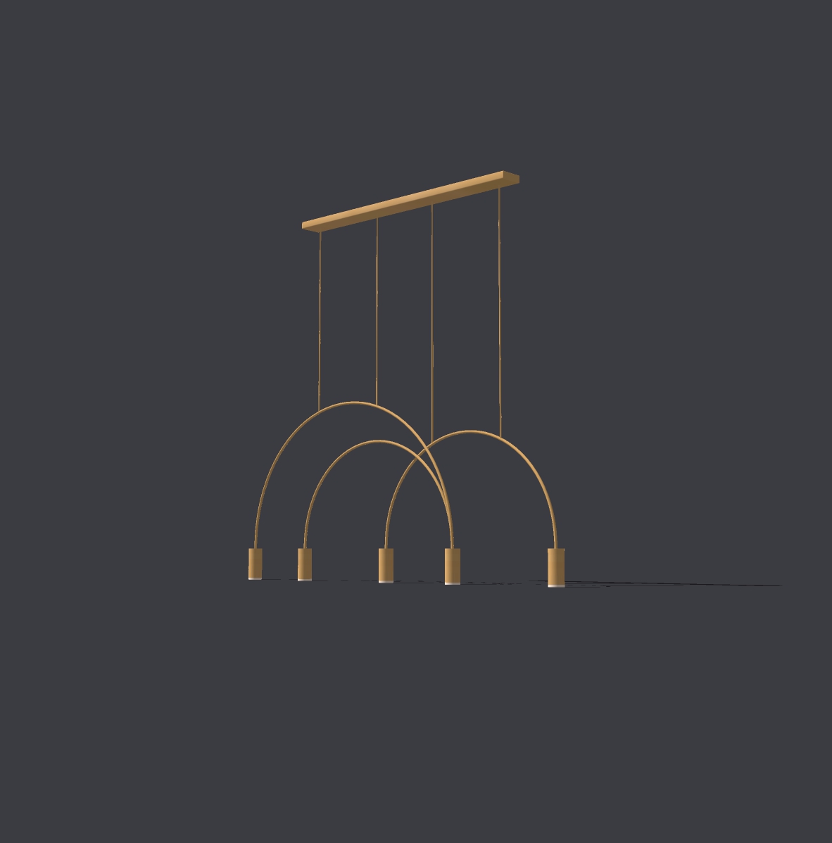 Mẫu đèn trong hình ảnh là một sản phẩm nghệ thuật được thiết kế với phong cách hiện đại và tối giản. Đèn được cấu tạo bởi các vòng cung mềm mại, tạo nên những đường cong hài hòa và nổi bật trong không gian sống. Chất liệu kim loại mạ vàng mang đến vẻ sang trọng, kết hợp với ánh sáng ấm áp từ bốn bóng đèn LED nhỏ gọn, tạo ra một không gian ấm cúng và hấp dẫn.