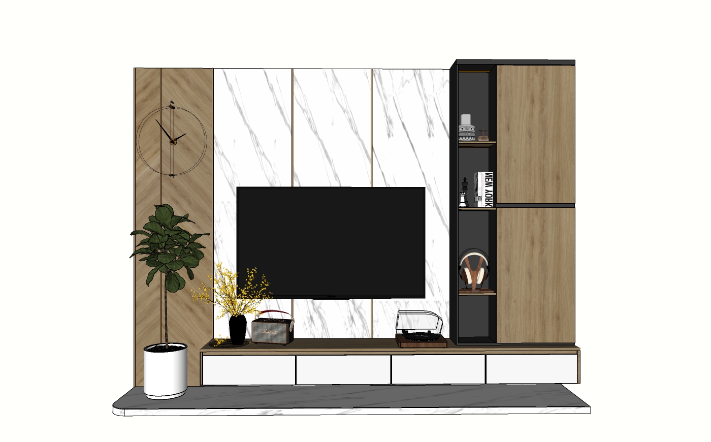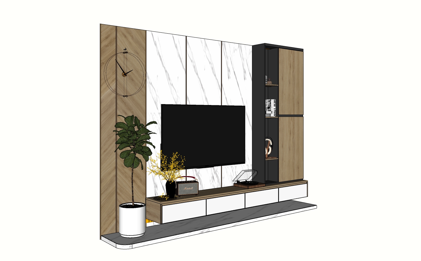 Model SketchUp kệ tivi treo tường phong cách hiện đại phối đá trắng và gỗ (Free Download)