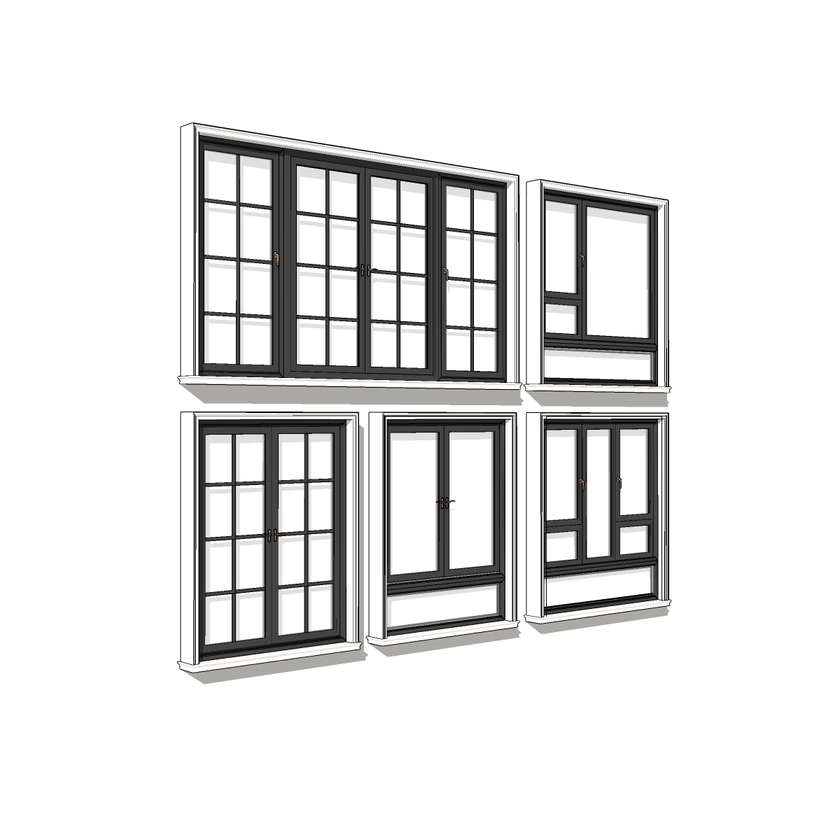 Các hình ảnh hiển thị một tập hợp gồm năm mẫu cửa sổ với thiết kế hiện đại, tinh tế. Các cửa sổ này được làm từ khung nhôm màu đen chắc chắn, kết hợp với kính mờ tạo nên vẻ thanh lịch và chuyên nghiệp. Thiết kế nhấn mạnh vào tính thẩm mỹ đơn giản nhưng tinh tế, phù hợp cho nhiều phong cách kiến trúc khác nhau.