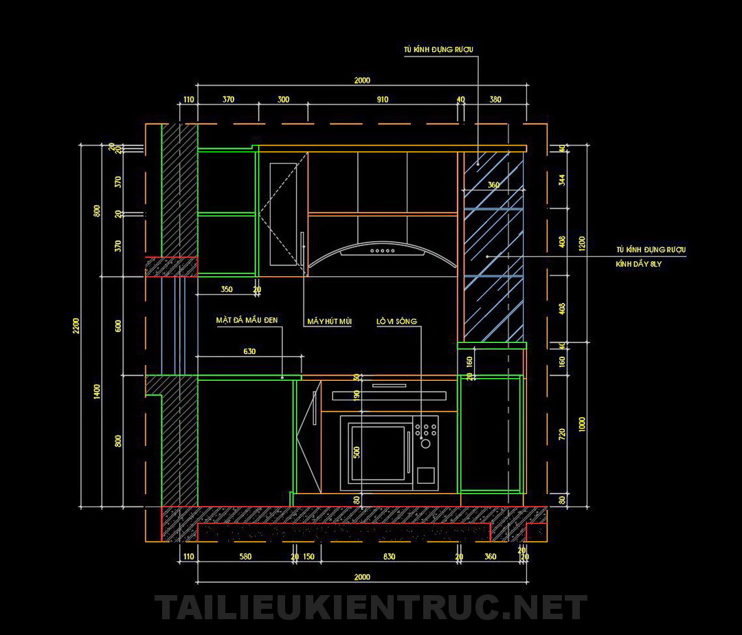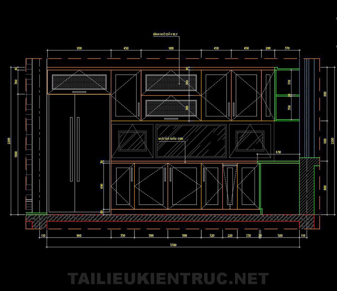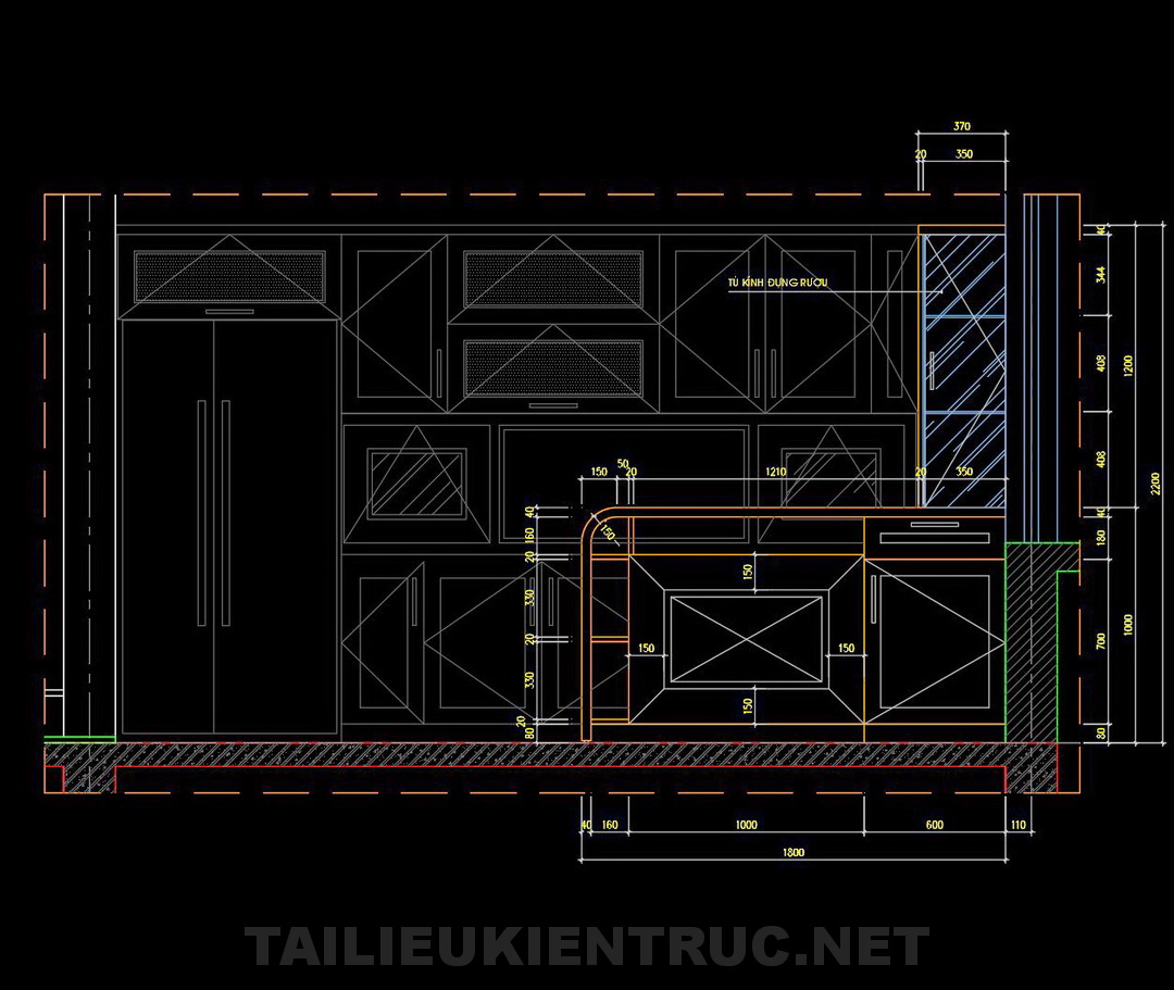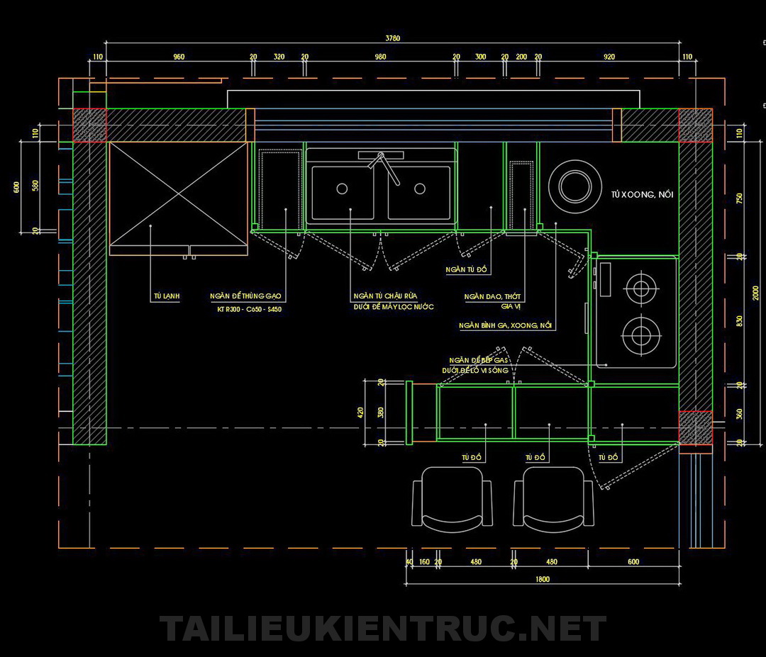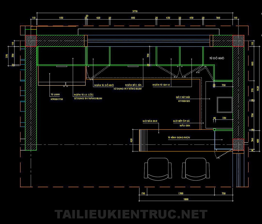 Bản thiết kế bao gồm nhiều hình ảnh chi tiết về bố trí nội thất cũng như thông số kỹ thuật chính xác cho từng phần của căn bếp.