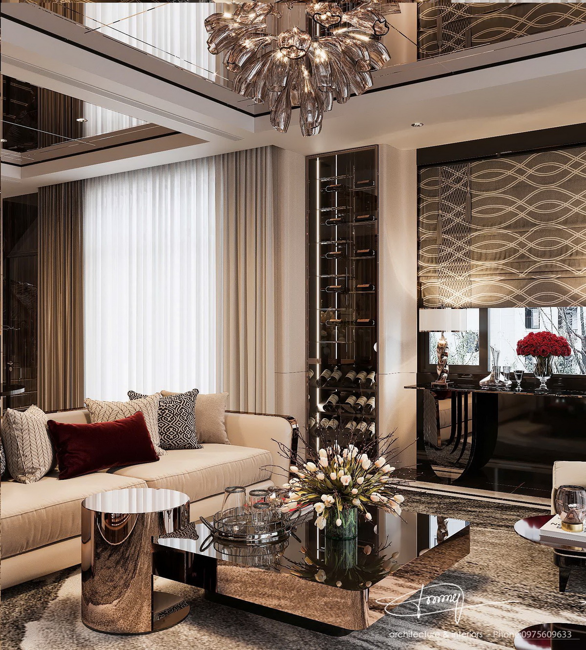 • Chất lượng chuyên nghiệp: Mỗi chi tiết trong không gian được chăm chút kỹ lưỡng, từ sofa, bàn uống nước đến đèn chùm trên trần.