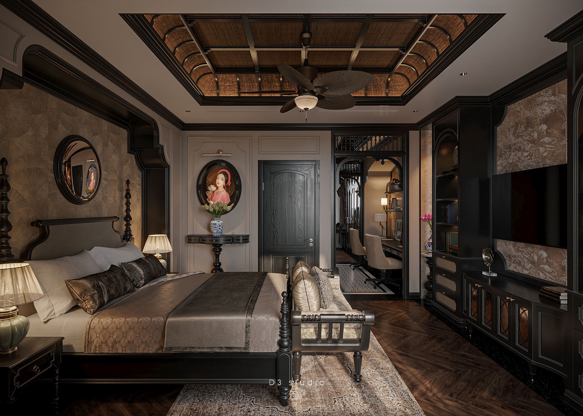 Ứng dụng thực tế của thiết kế này bao gồm việc tạo ra một không gian sống lý tưởng cho những ai yêu thích phong cách cổ điển nhưng không kém phần hiện đại. Phòng ngủ này không chỉ là nơi nghỉ ngơi mà còn là không gian thể hiện phong cách sống sang trọng và đẳng cấp.