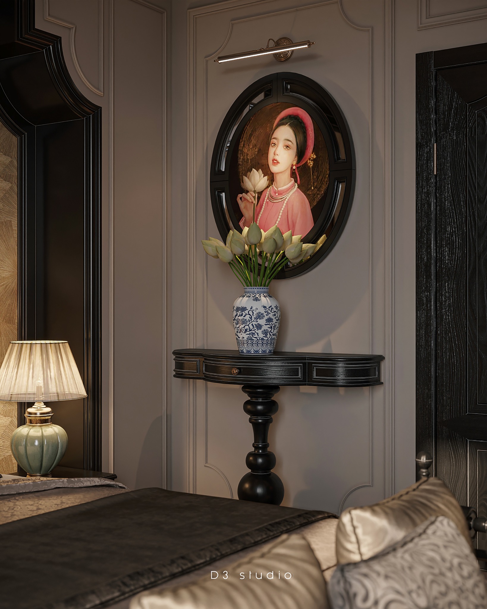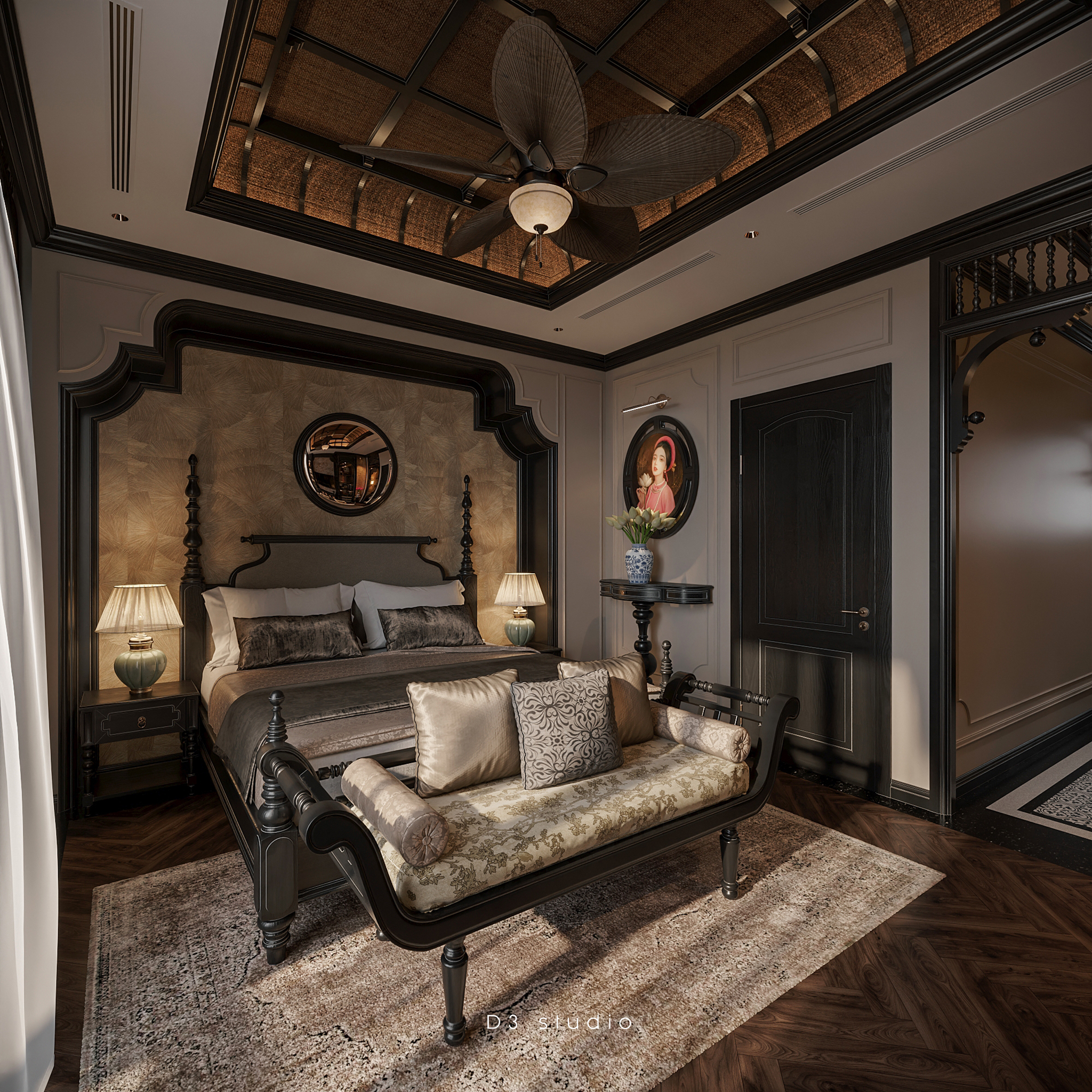 Hình ảnh cho thấy một phòng ngủ tinh tế với thiết kế tân cổ điển. Những chi tiết hoa văn trên tường, trần nhà và nội thất được thể hiện tỉ mỉ, tạo nên một không gian sống đầm ấm và thanh lịch. Ánh sáng tự nhiên dịu nhẹ kết hợp với ánh sáng đèn tạo nên không khí yên tĩnh và thư thái.