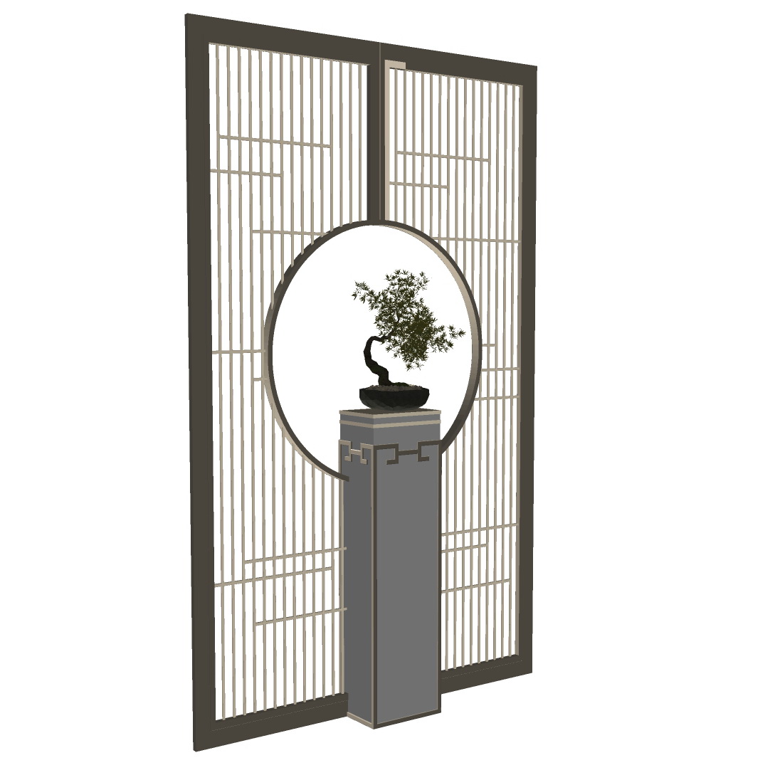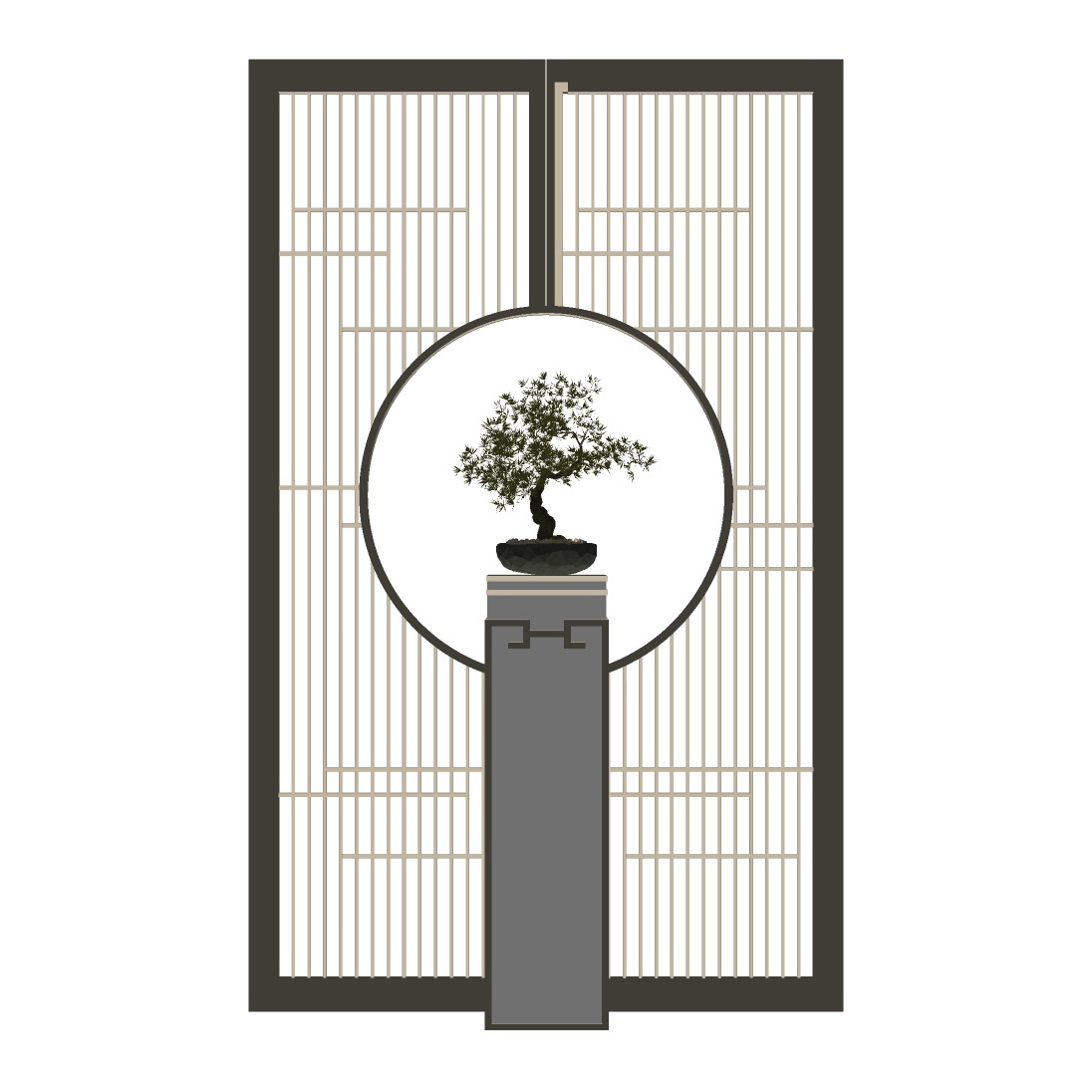 Trong hình ảnh, ta thấy thiết kế bao gồm một cây bonsai được đặt trên một bệ cao, nằm trước một tấm bình phong gỗ có họa tiết ô vuông và hình tròn. Bình phong có màu nâu tự nhiên, tạo cảm giác ấm cúng và hài hòa với môi trường sống. Cây bonsai, biểu tượng của sự tinh tế và nghệ thuật, là điểm nhấn chính của bố cục, tạo ra sự liên kết giữa thiên nhiên và kiến trúc.