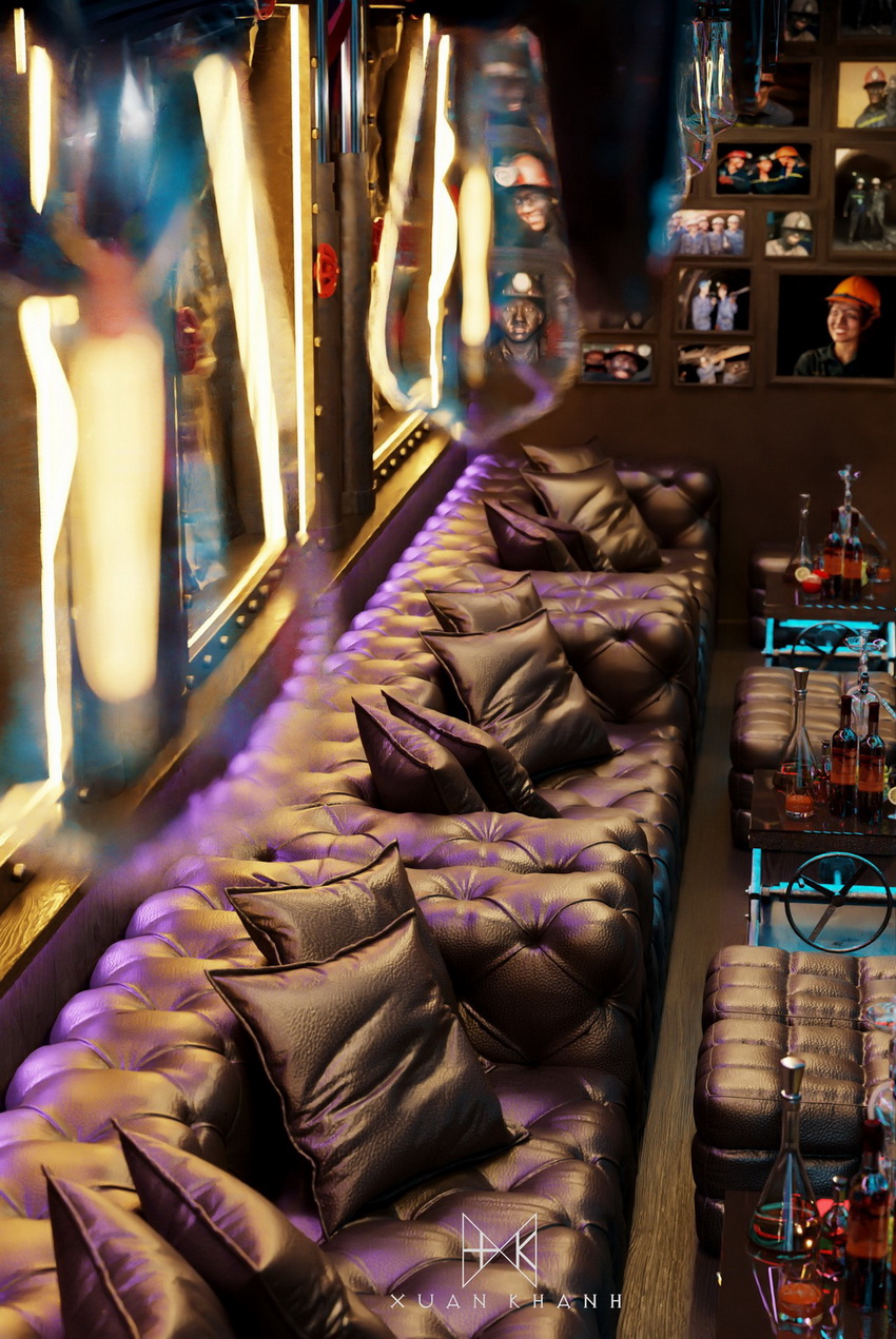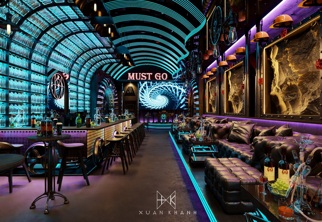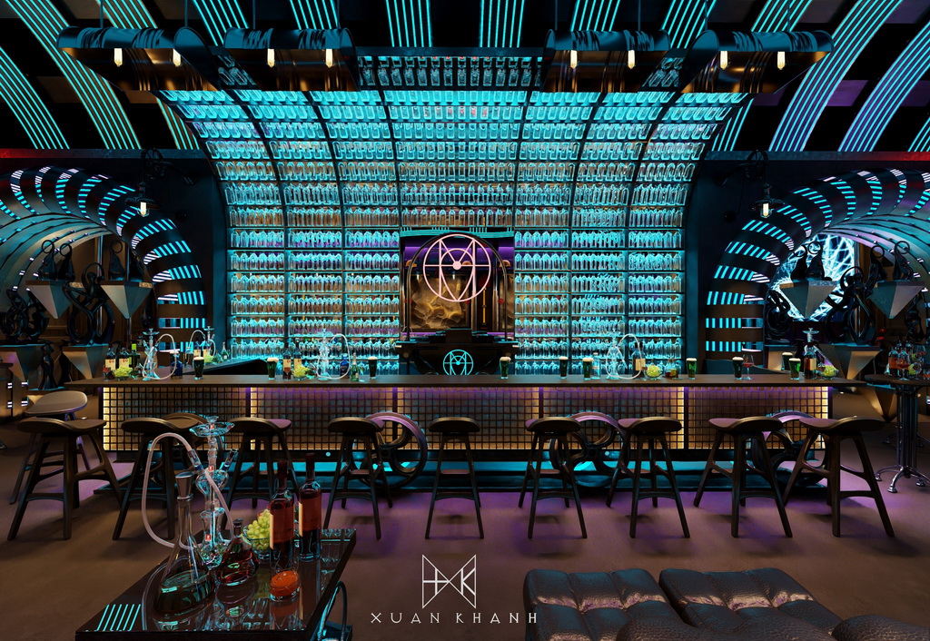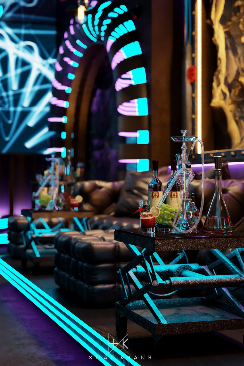Phòng karaoke này được thiết kế với mục tiêu tạo ra một trải nghiệm âm nhạc và giải trí tối ưu cho người sử dụng. Màu sắc chủ đạo xanh dương cùng hệ thống ánh sáng neon tạo nên sự trẻ trung và năng động. Cấu trúc của quán bar được thiết kế độc đáo, với các chai thủy tinh xếp theo hình vòm tạo cảm giác hiện đại và sang trọng.