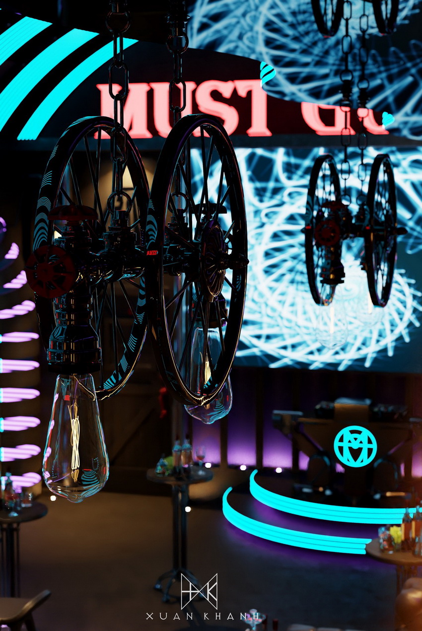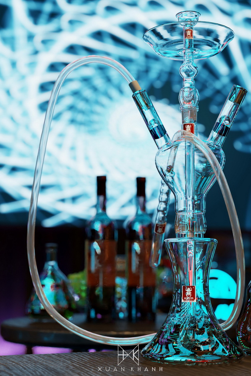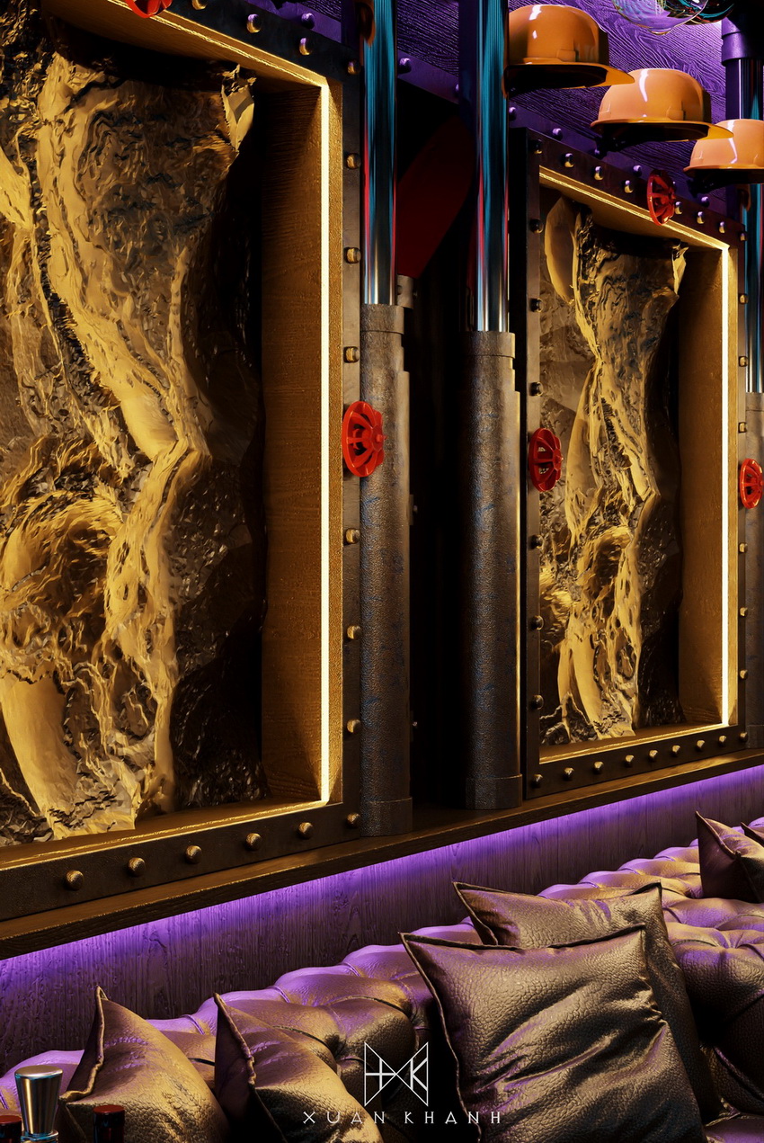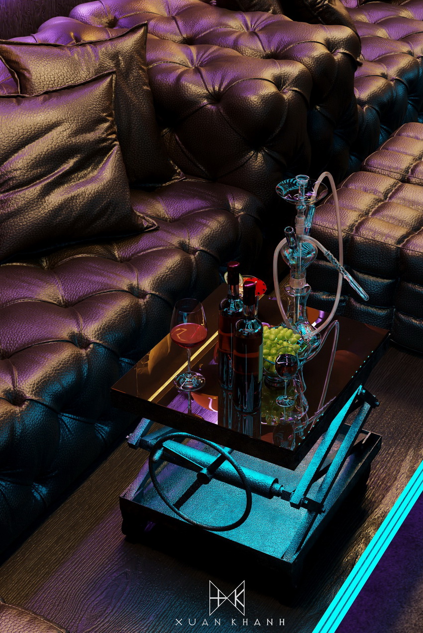 Phòng karaoke này được thiết kế với mục tiêu tạo ra một trải nghiệm âm nhạc và giải trí tối ưu cho người sử dụng. Màu sắc chủ đạo xanh dương cùng hệ thống ánh sáng neon tạo nên sự trẻ trung và năng động. Cấu trúc của quán bar được thiết kế độc đáo, với các chai thủy tinh xếp theo hình vòm tạo cảm giác hiện đại và sang trọng.