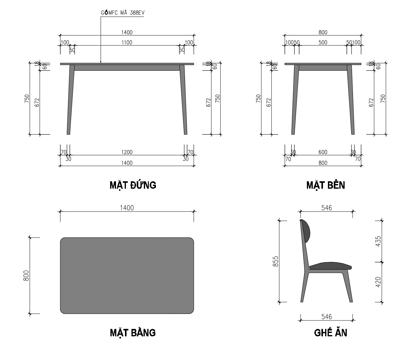 Các hình ảnh trong tài liệu cho thấy bản vẽ chi tiết của bàn ăn với các góc nhìn khác nhau, bao gồm mặt đứng, mặt bên, và mặt bằng của cả bàn và ghế. Mỗi hình ảnh đều được chú thích kích thước rõ ràng, cung cấp thông tin quan trọng cho các nhà thiết kế và thợ thi công.