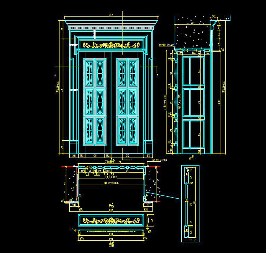Trong hình ảnh, chúng ta có thể thấy bản vẽ kỹ thuật của một bộ cửa bao gồm cả thiết kế cửa chính và phần khung bao quanh. Các chi tiết được thể hiện rõ ràng với các kích thước cụ thể, giúp người xem dễ dàng hình dung và thực thi trong thực tế.