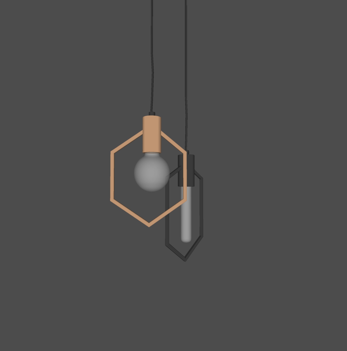 Hình ảnh hiển thị hai mẫu đèn treo hiện đại được thiết kế với khung hình học tinh tế. Sản phẩm kết hợp giữa chất liệu kim loại và bóng đèn thủy tinh, tạo nên điểm nhấn ấn tượng cho bất kỳ không gian nội thất nào. Đèn đầu tiên có khung dây hình ngũ giác, màu vàng đồng, bao quanh một bóng đèn hình cầu. Đèn thứ hai có thiết kế dài hơn, với khung dây đen hình tổ chim, ôm lấy bóng đèn ống. Cả hai thiết kế đều tập trung vào việc tạo ra ánh sáng mềm mại, mang lại cảm giác ấm cúng và sang trọng.