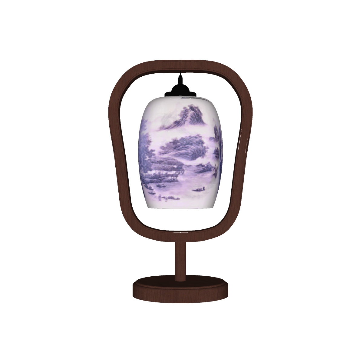 Chiếc đèn này mang một thiết kế tinh xảo với phần thân đèn bằng sứ được tô điểm bằng những nét vẽ phong cảnh tinh tế và độc đáo. Hình ảnh phong cảnh nhẹ nhàng và hài hòa mang lại cảm giác thư giãn và bình yên cho không gian sống. Phần khung đèn được làm từ gỗ cao cấp, uốn cong một cách khéo léo để bảo vệ và nâng đỡ phần chao đèn.