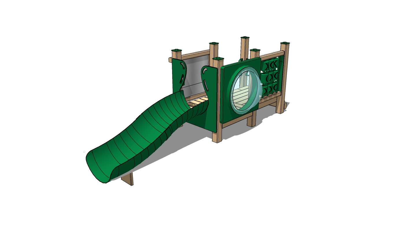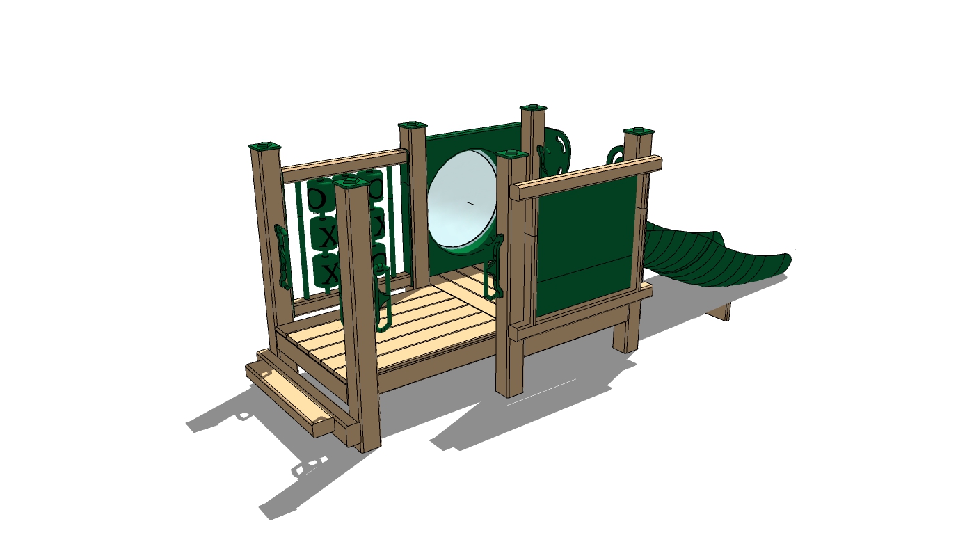 Mô hình sân chơi này được thiết kế với cấu trúc đơn giản nhưng vô cùng hiệu quả, bao gồm một cầu trượt, khung leo và một bức tường có cửa sổ quan sát. Tất cả đều được bố trí hợp lý để vừa thu hút sự chú ý của trẻ em, vừa đảm bảo an toàn tối đa.
