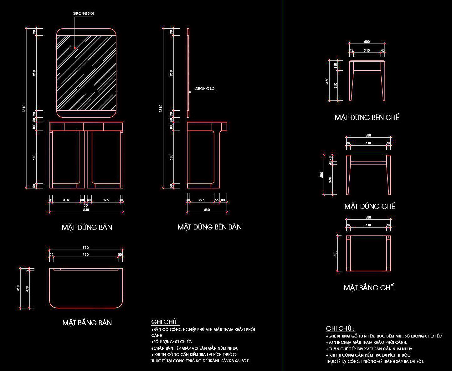 Bản vẽ mô tả tổng thể và chi tiết từng góc nhìn của một chiếc bàn kèm gương soi và một chiếc ghế. Các bản vẽ này bao gồm các mặt đứng và mặt bằng đầy đủ kích thước, giúp dễ dàng hình dung và triển khai thực tế.