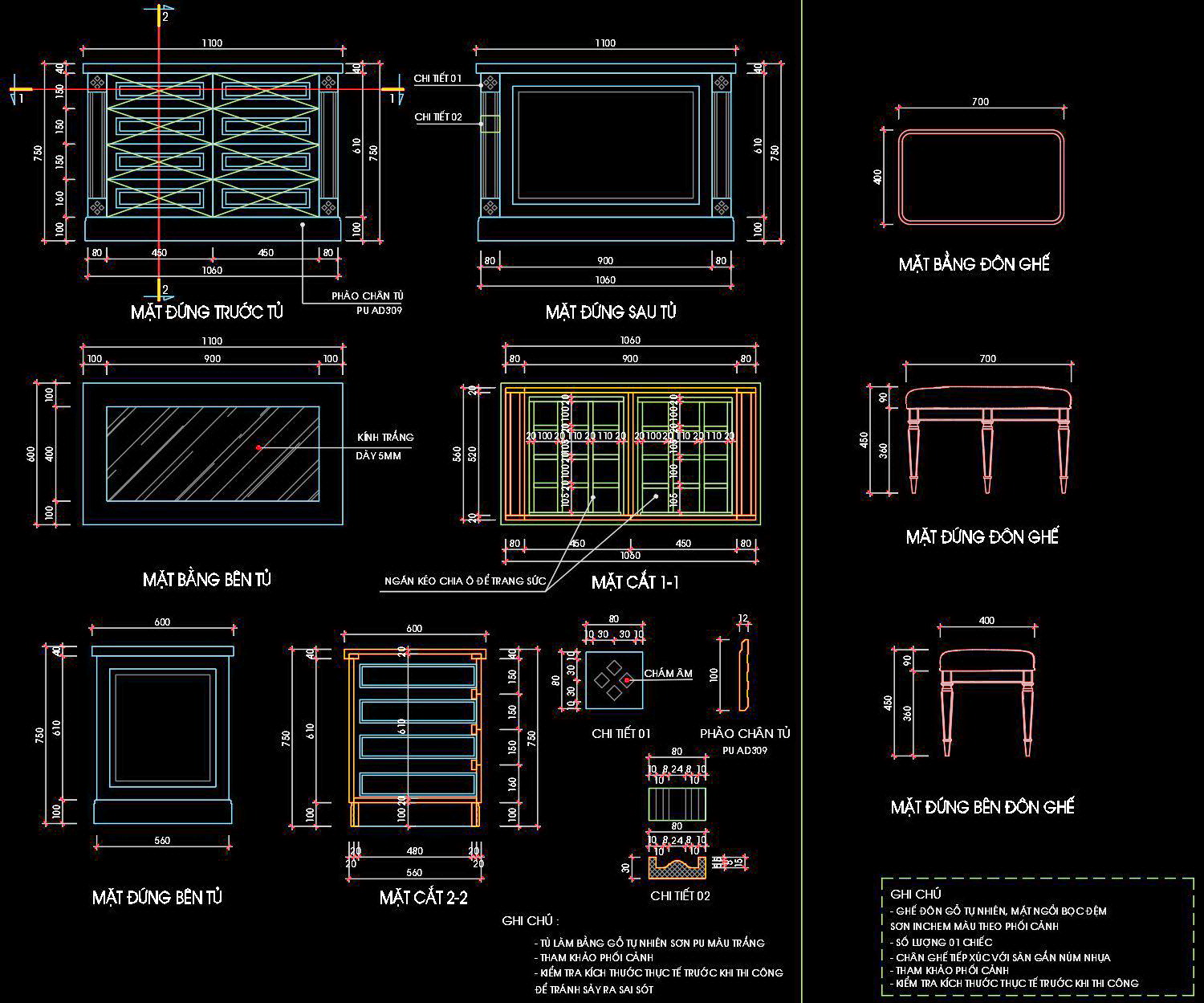 Tài liệu này cung cấp bản vẽ thiết kế chi tiết của tủ và ghế đơn, giúp định hình rõ ràng kích thước và cấu trúc của các sản phẩm nội thất.