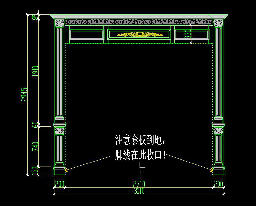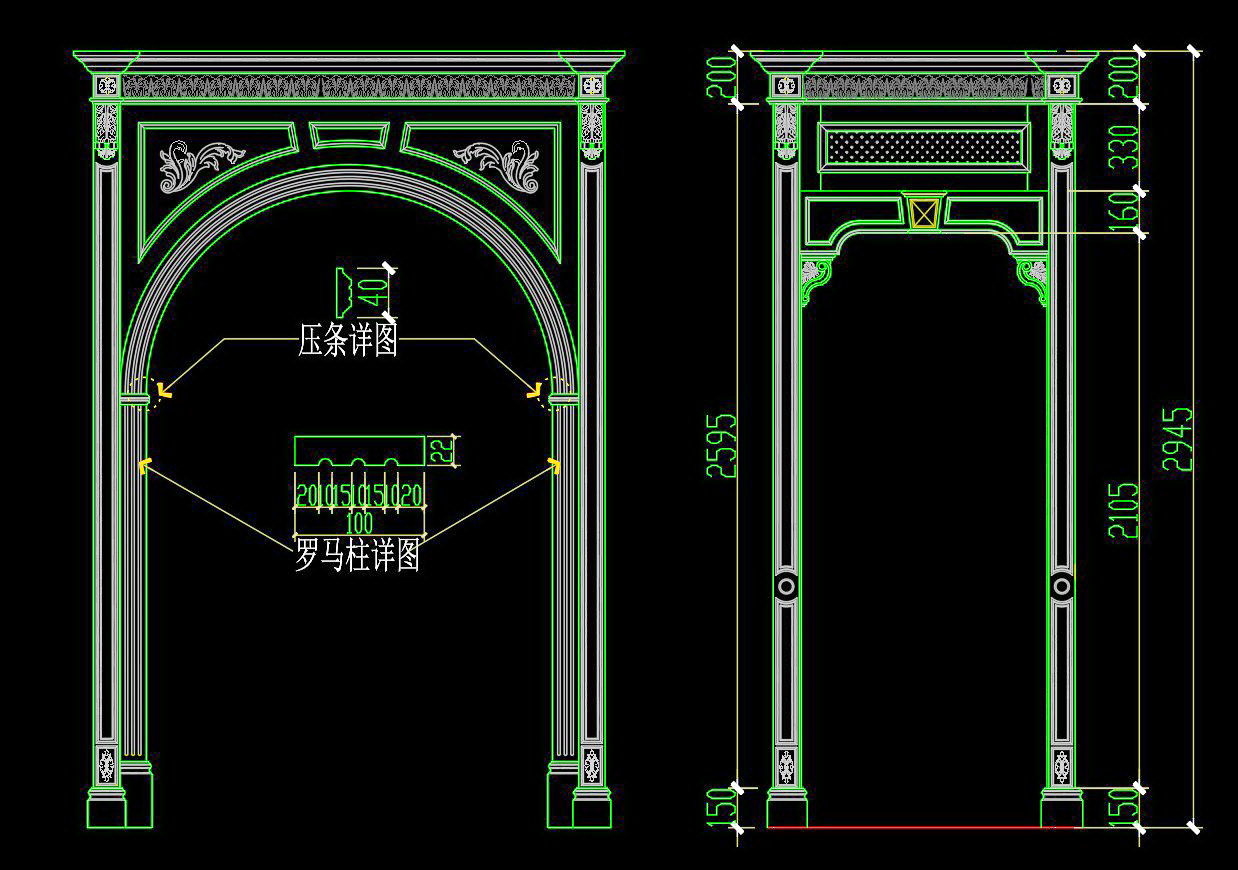 Bản vẽ chi tiết này thể hiện một khung kiến trúc cổ điển với các chi tiết hoa văn phức tạp. Các hình vẽ mô tả rõ ràng kích thước và vị trí của từng chi tiết từ các góc nhìn khác nhau.