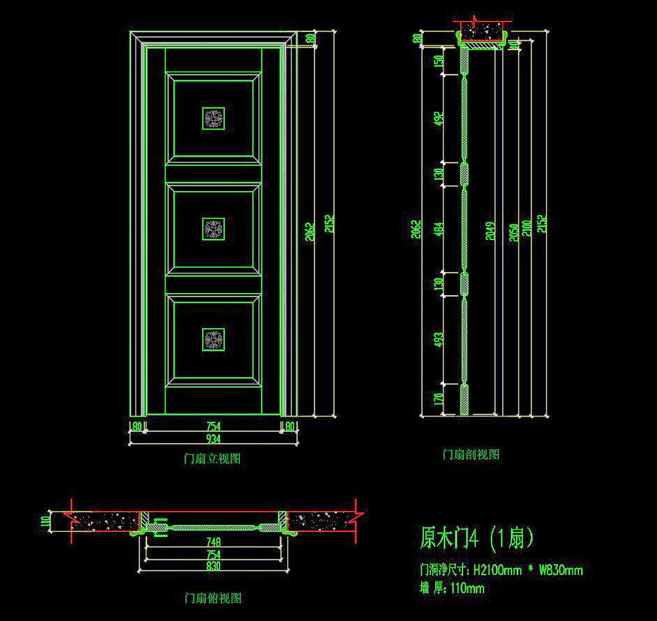 - Mặt trước: Hiển thị mặt tiền với chi tiết trang trí rõ nét trên các ô vuông. Kích thước tổng thể của cửa là 2100mm chiều cao và 830mm chiều rộng.