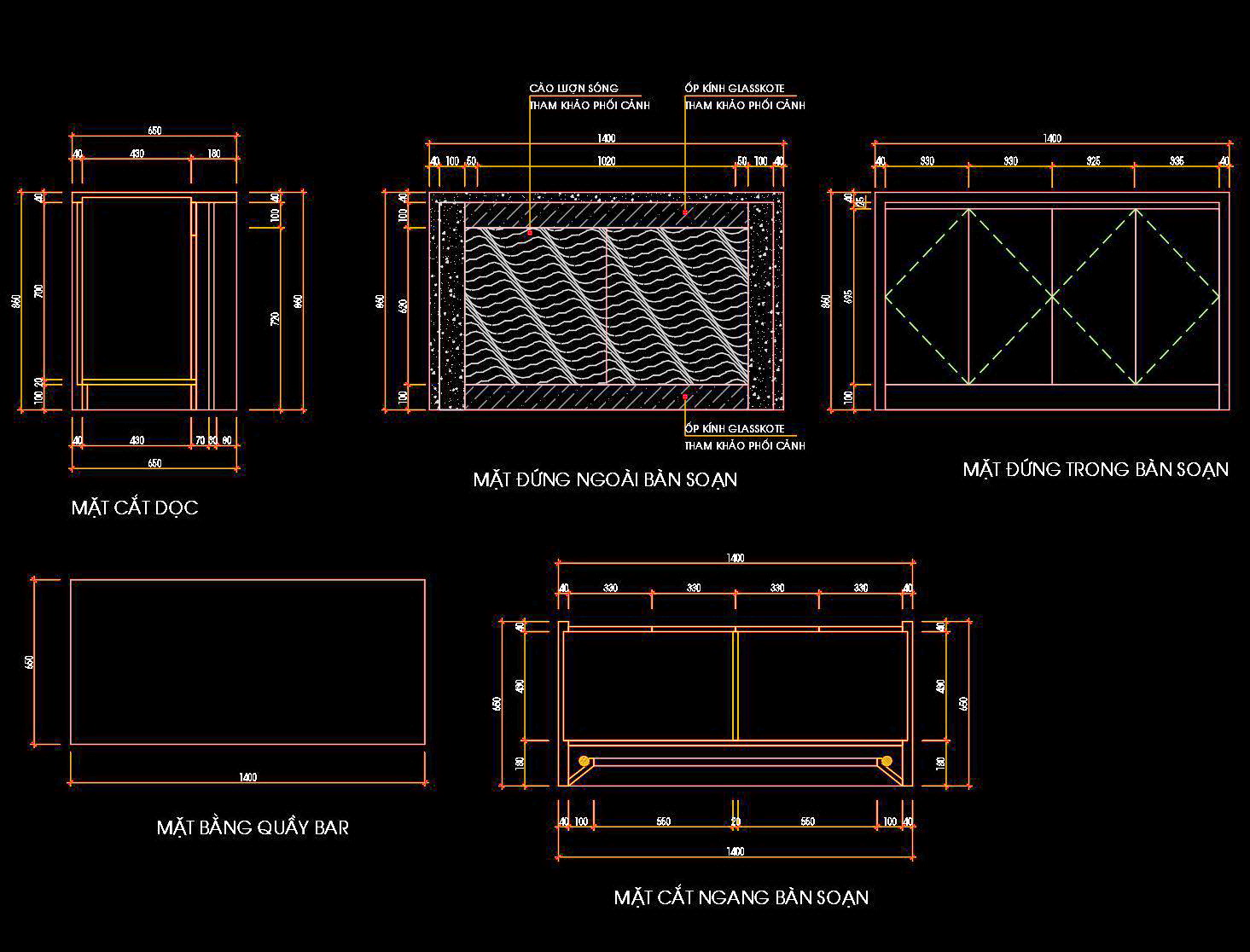 Chi tiết kỹ thuật của các bản vẽ chỉ ra kích thước chính xác như chiều dài 1400mm, chiều rộng và các thông số khác. Vật liệu sử dụng cho ốp kính và các thành phần khác cũng được ghi chú rõ ràng, đảm bảo rằng nhà thiết kế có thể lựa chọn vật liệu phù hợp.