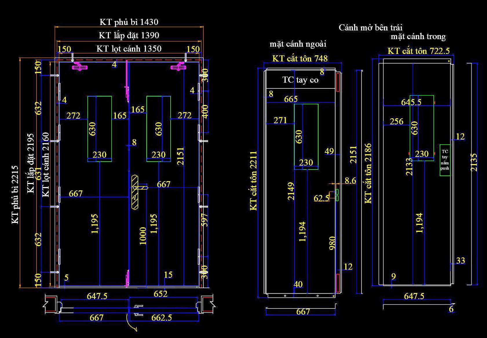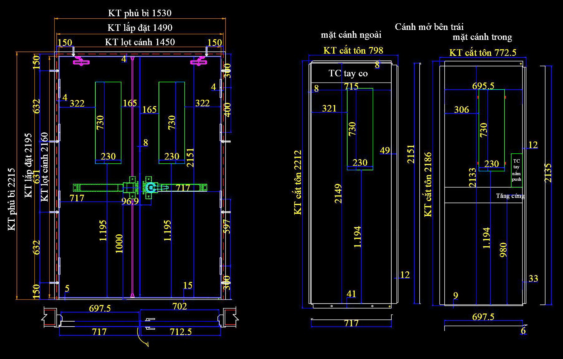Các hình ảnh trên là bản vẽ kỹ thuật của hai loại cửa với kích thước, cấu tạo và cách lắp đặt khác nhau. Mỗi bản vẽ đều thể hiện chi tiết từ kích thước tổng thể đến từng phần tử nhỏ, đảm bảo dễ dàng áp dụng trong thực tế.