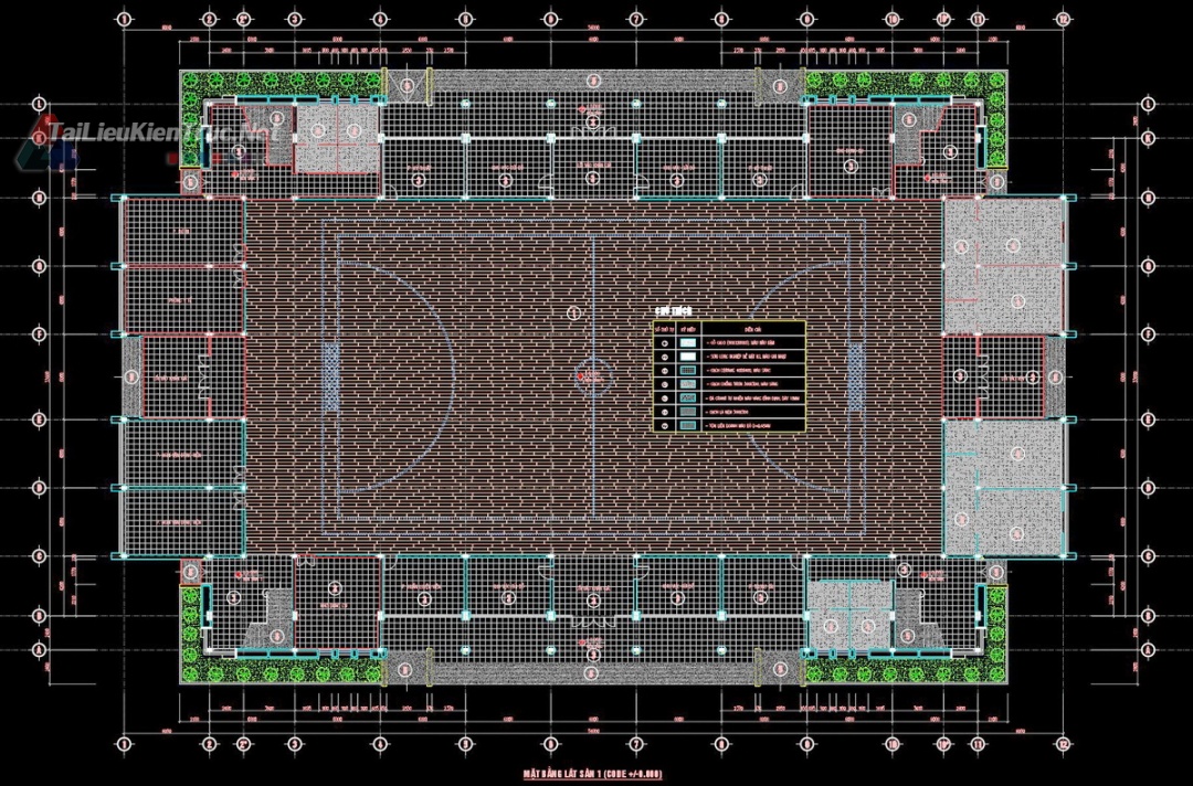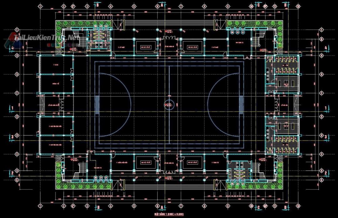 Mặt bằng công năng (+0.000): Bố trí sân thi đấu tiêu chuẩn trung tâm, hệ thống phòng chức năng phụ trợ bao gồm: Phòng y tế, phòng huấn luyện viên, khu vực kho dụng cụ, phòng kỹ thuật và khu vệ sinh/thay đồ quy mô lớn.