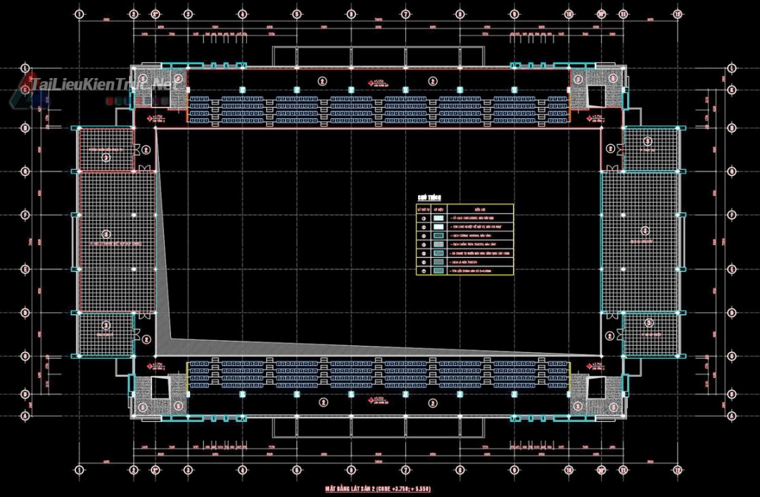 Mặt bằng khán đài & Tầng lửng: Chi tiết khu vực ghế ngồi khán giả, lối thoát hiểm và hệ thống hành lang giao thông.