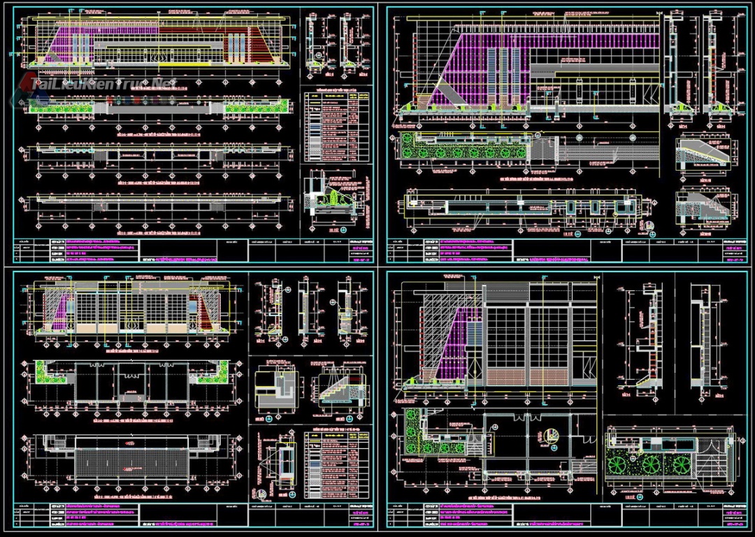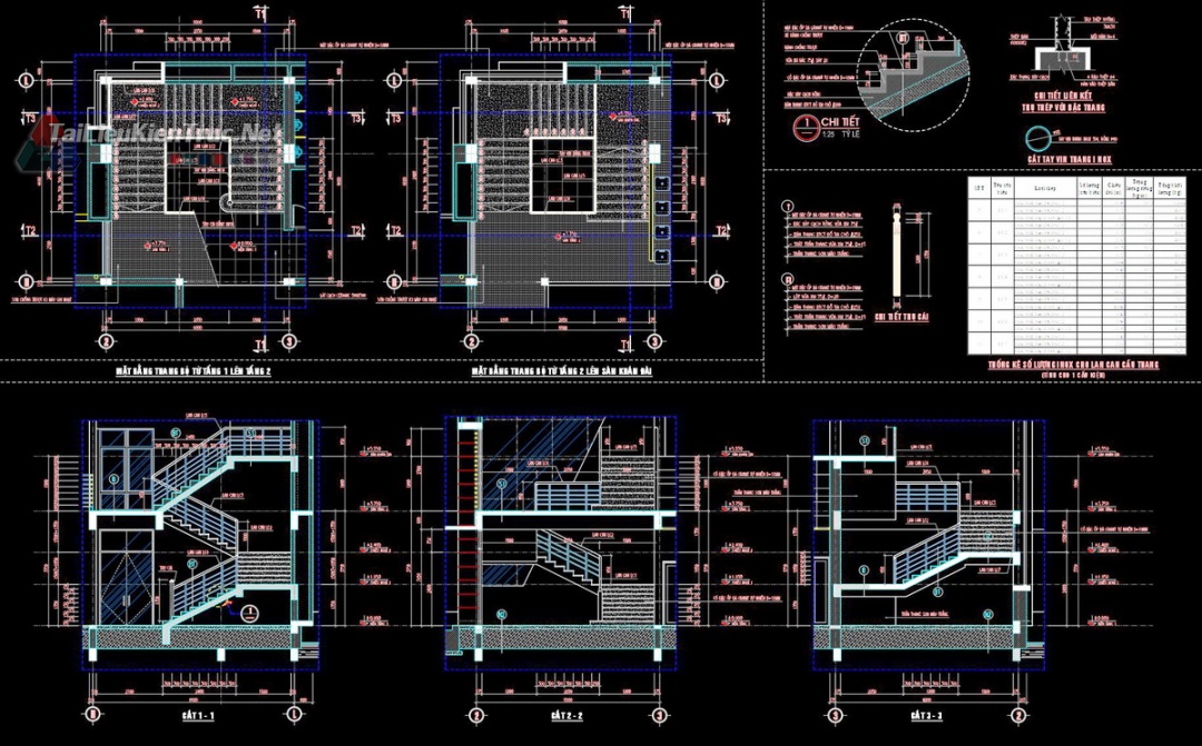 Chi tiết cầu thang & Lan can: Bản vẽ chi tiết cấu tạo thang bộ, tay vịn inox và các chi tiết liên kết cơ khí.