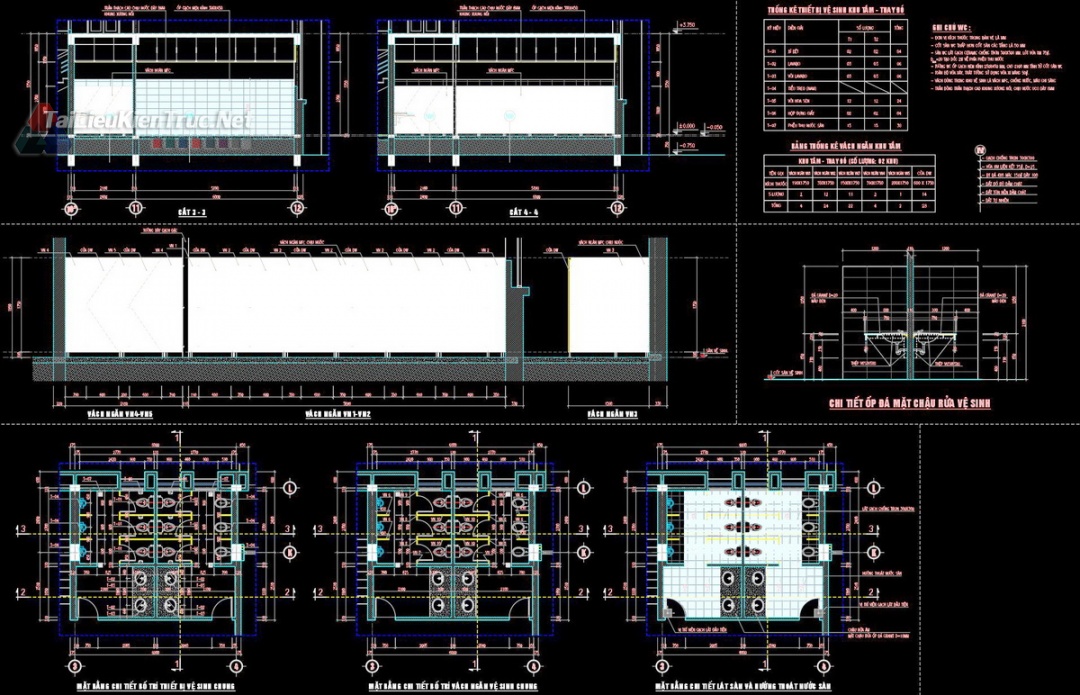 Hồ sơ chi tiết khu vệ sinh: Triển khai chi tiết vách ngăn Compact/MFC, hệ thống thoát sàn và bố trí thiết bị vệ sinh (Schedules).