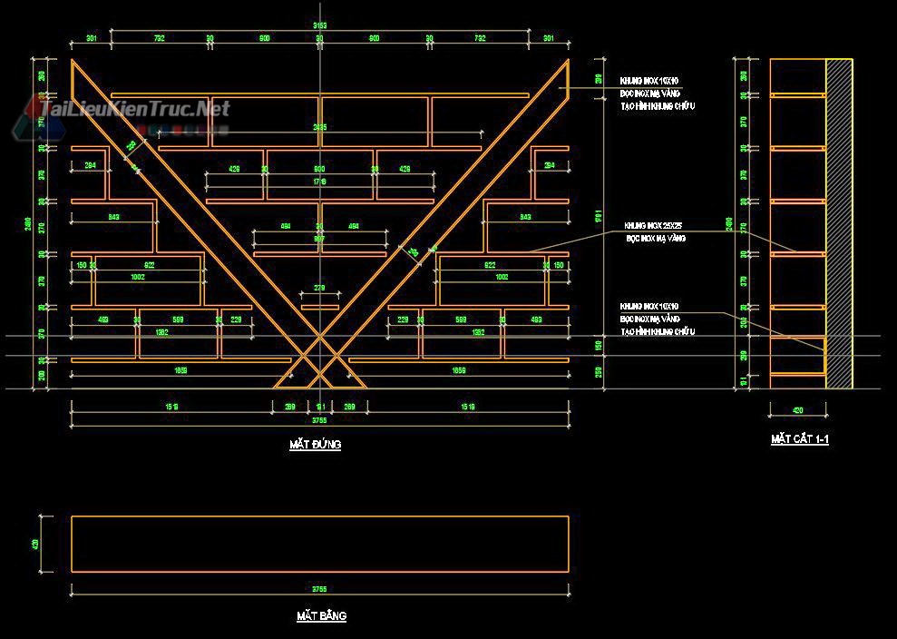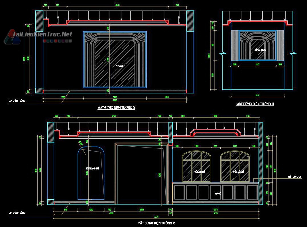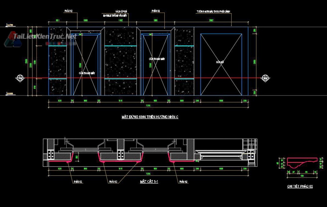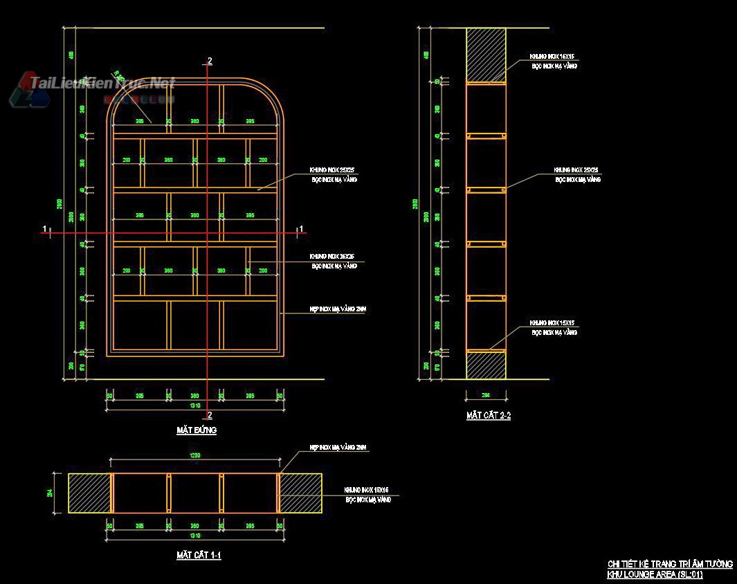 Ghi chú vật liệu rõ ràng: Gỗ ốp, inox nẹp trang trí, gương 5mm, giúp việc bóc tách khối lượng và chỉ định vật liệu trở nên dễ dàng.
