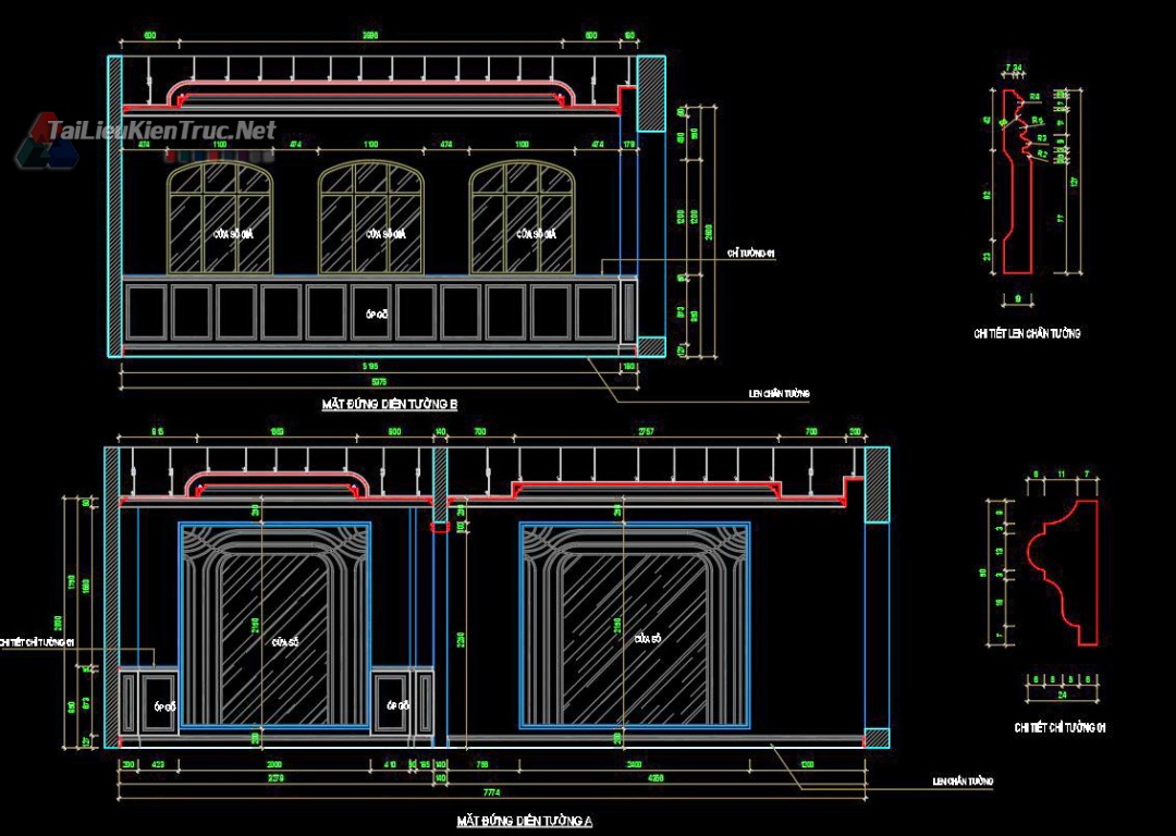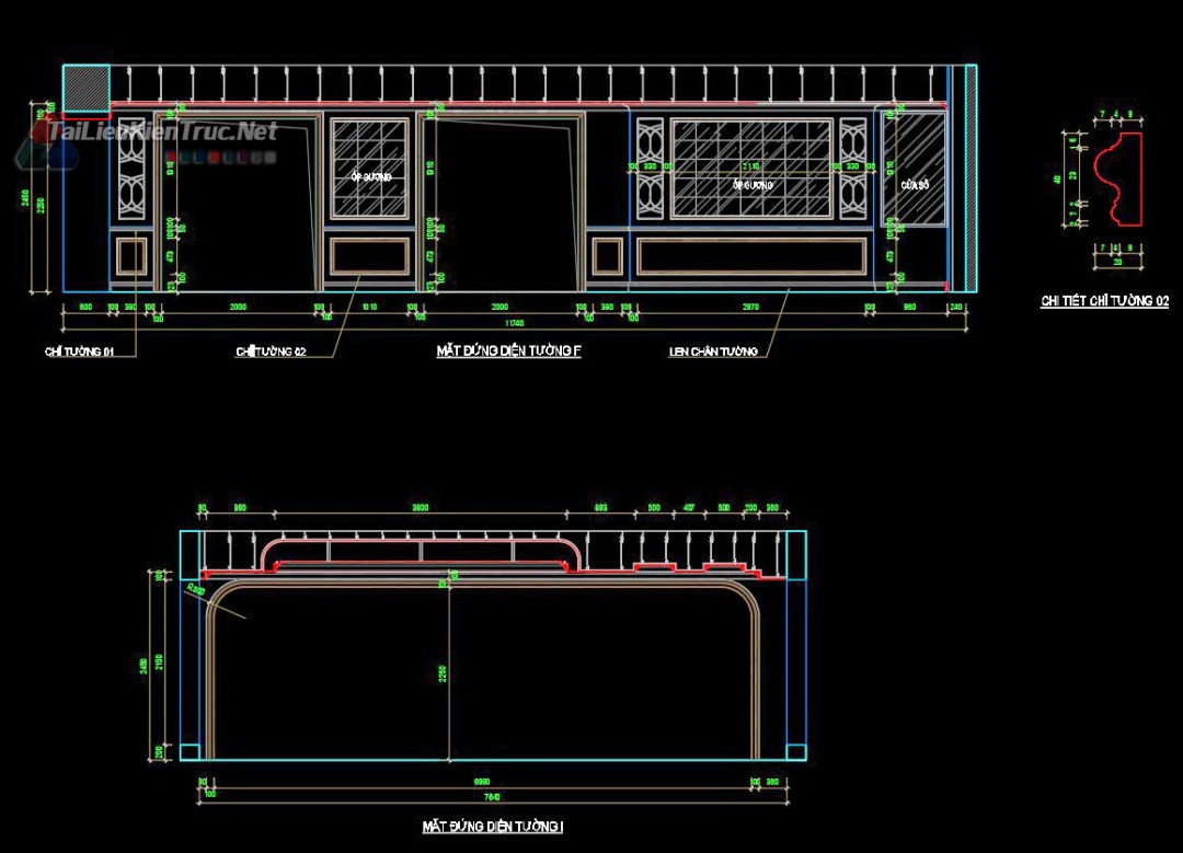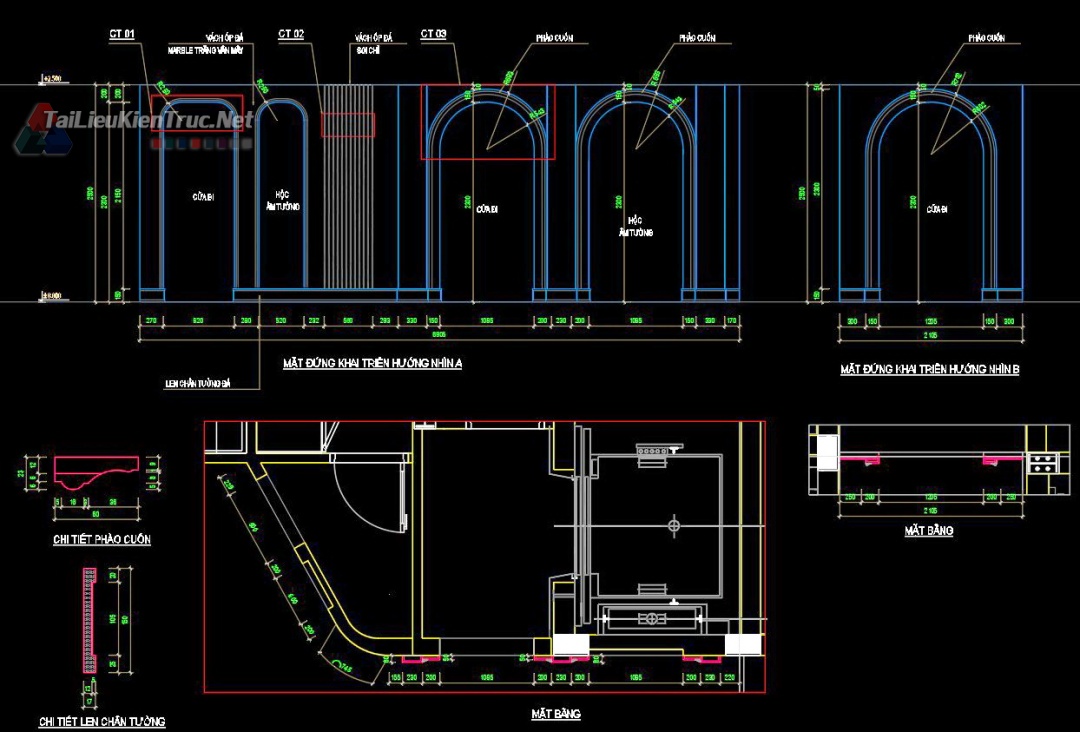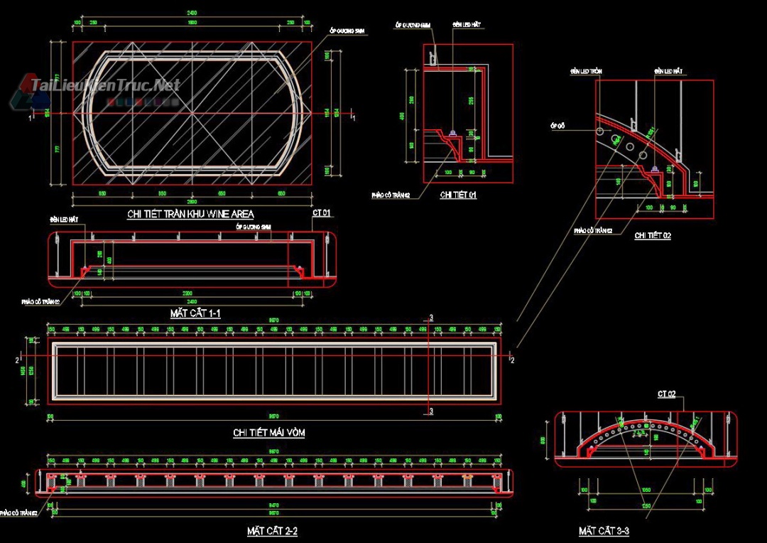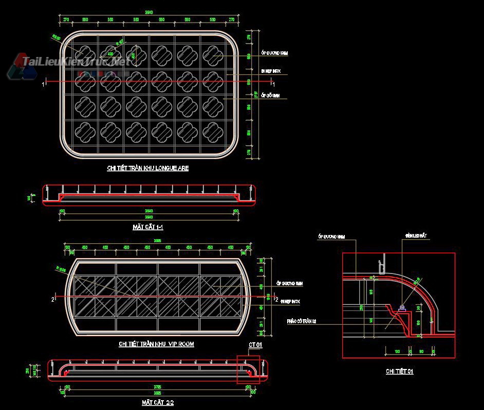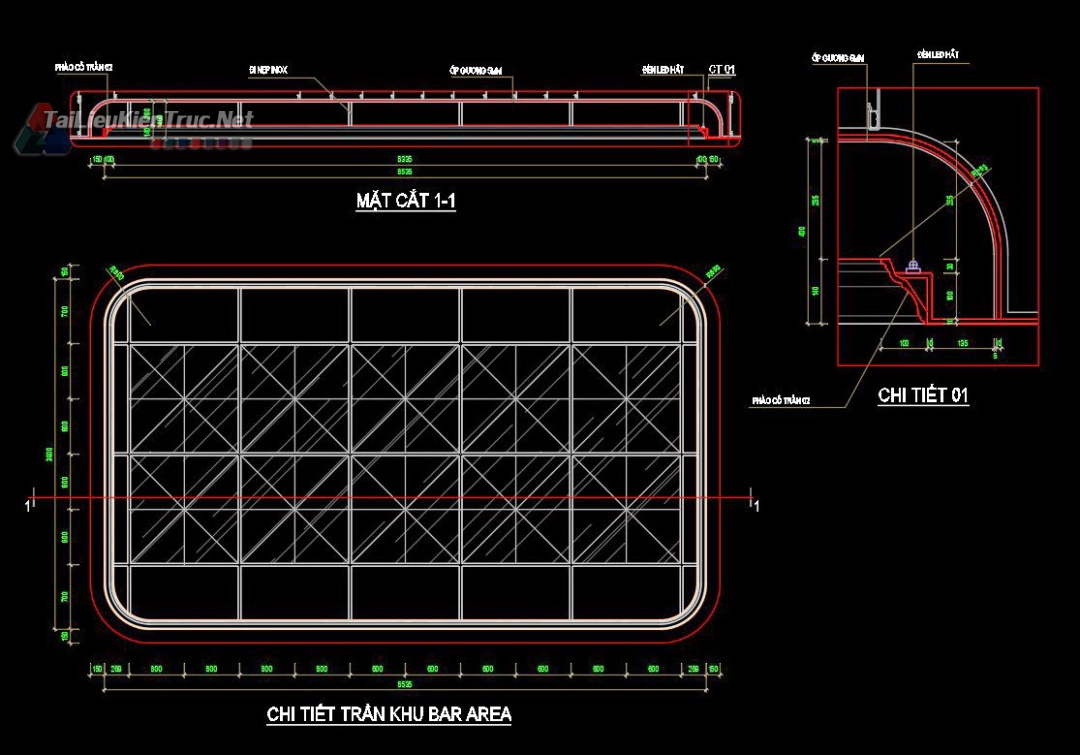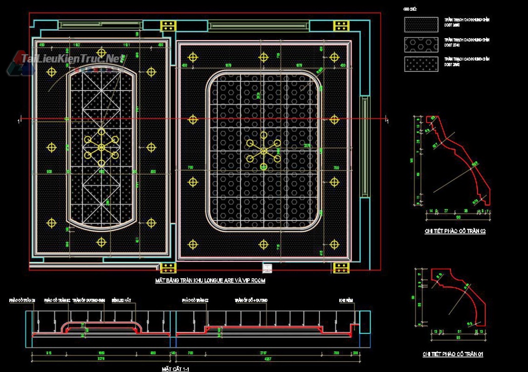 Hồ sơ bao gồm các bản vẽ phóng to chi tiết phào cổ trần (Detail 01, 02) với đầy đủ thông số kích thước, bán kính cong (R).
