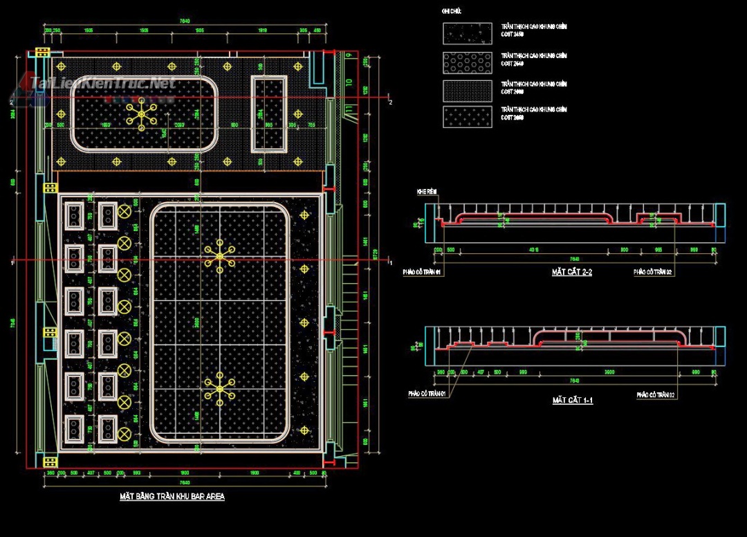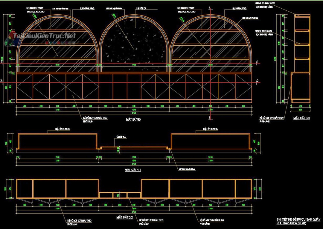 Bar Counter: Bản vẽ chi tiết quầy bar, mặt cắt cấu tạo đảm bảo tính thẩm mỹ và kỹ thuật thi công thực tế.
