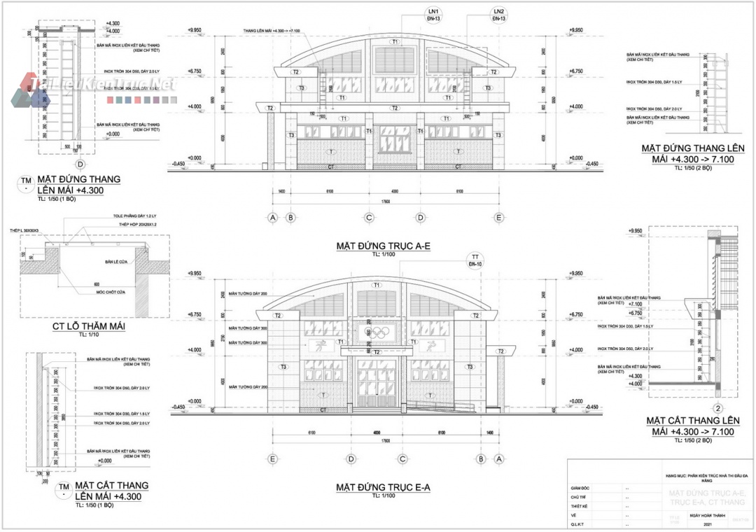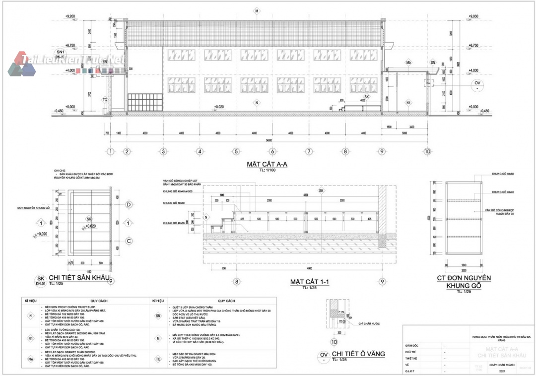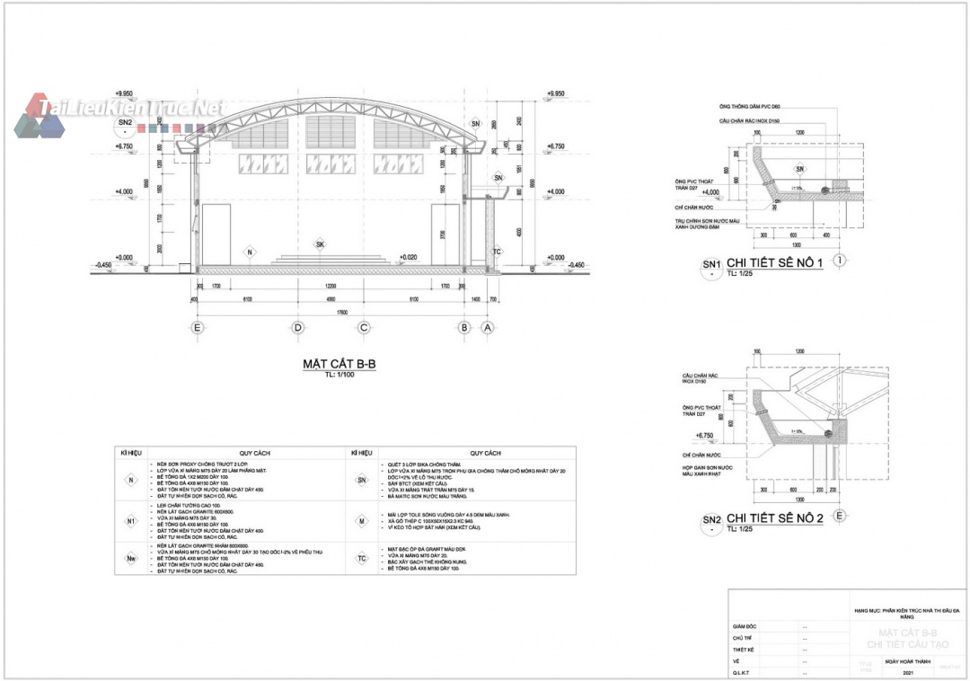 Chi tiết cấu tạo: Hồ sơ cung cấp đầy đủ chi tiết sảnh chính, sảnh phụ, chi tiết thang lên mái, hệ thống máng thu nước (sê-nô) và thoát nước mái.