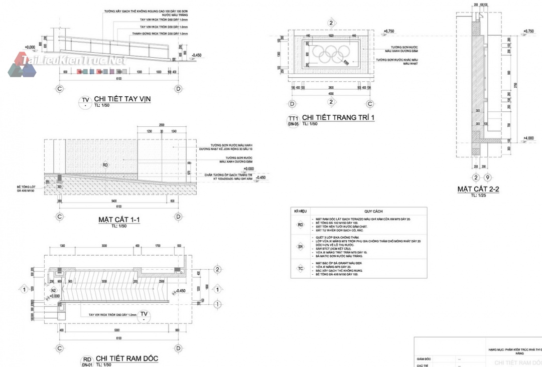 Hệ thống Ram dốc: Thiết kế chi tiết ram dốc dành cho người khuyết tật, tuân thủ nghiêm ngặt tiêu chuẩn thiết kế công trình công cộng.
