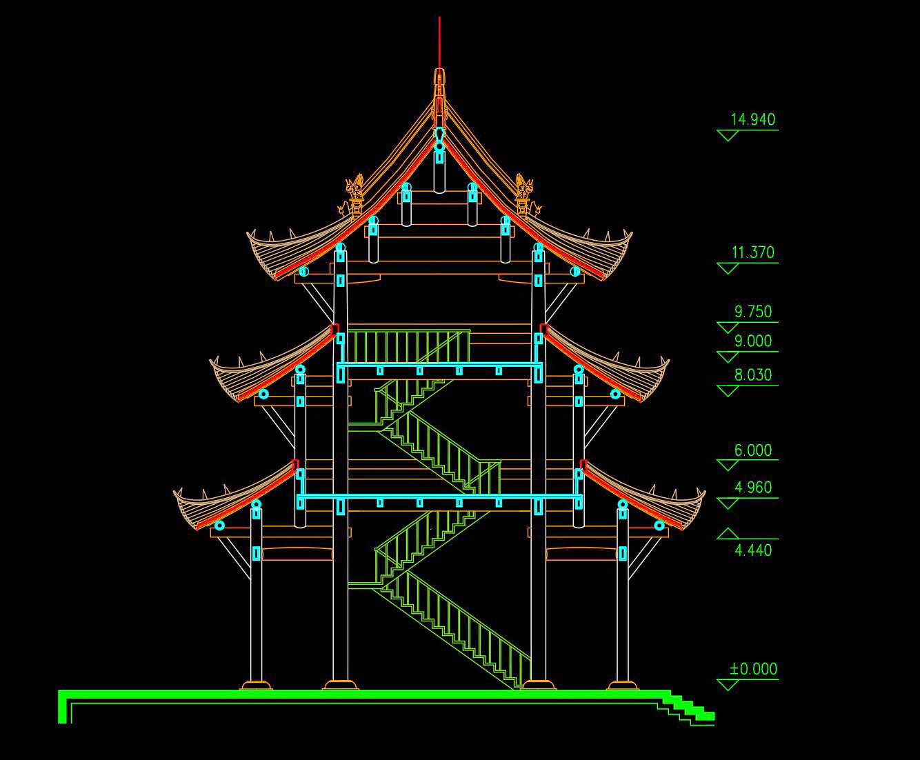 Hình ảnh đầu tiên cho thấy mặt cắt của một công trình kiến trúc truyền thống. Công trình có ba tầng với các chi tiết đặc trưng của kiến trúc Á Đông như mái cong và cột kèo chắc chắn. Các tầng được kết nối với nhau bằng hệ thống cầu thang nội thất, tạo sự liên kết vững chắc và linh hoạt. Những đường nét thanh thoát và tỉ mỉ không chỉ góp phần tạo nên vẻ đẹp cho công trình mà còn thể hiện sự tinh tế trong thiết kế.