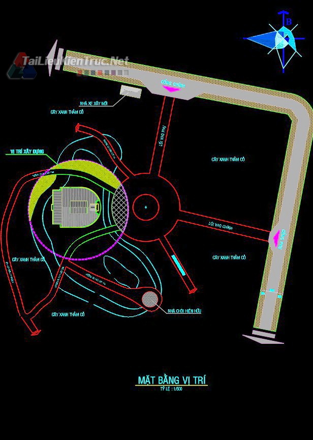 Bản vẽ thể hiện rõ vị trí xây dựng trong khuôn viên đất, cách bố trí giao thông nội bộ (lối vào chính, lối vào phụ), khu vực nhà xe và cảnh quan sân vườn xung quanh. Đây là dữ liệu quan trọng để tính toán mật độ xây dựng và quy hoạch cảnh quan.