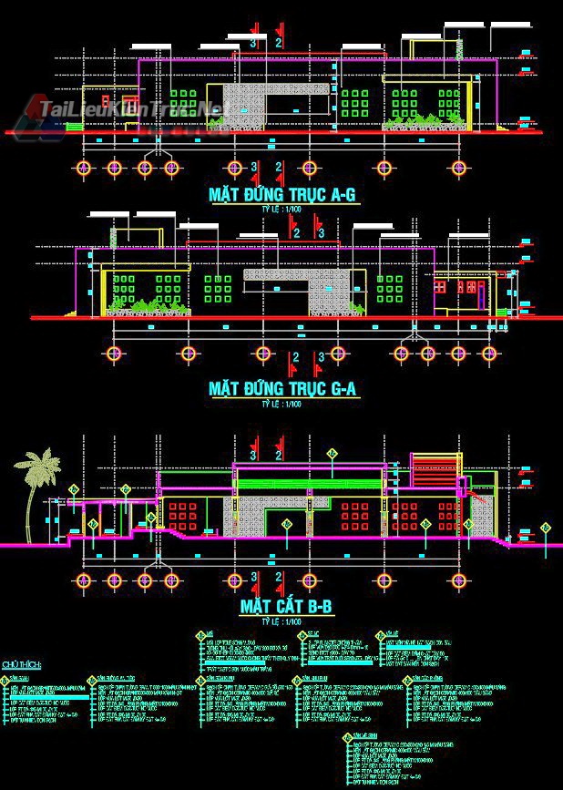 Mặt đứng trục 1-6, A-G: Thể hiện hình khối kiến trúc mạnh mẽ với các mảng kính lớn và gạch thông gió (bông gió), tạo sự thông thoáng tối đa.