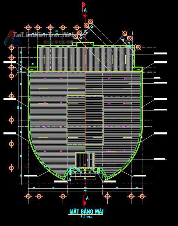 Mặt bằng mái: Chi tiết hệ thống mái, đặc biệt là phần mái vòm lấy sáng tự nhiên.