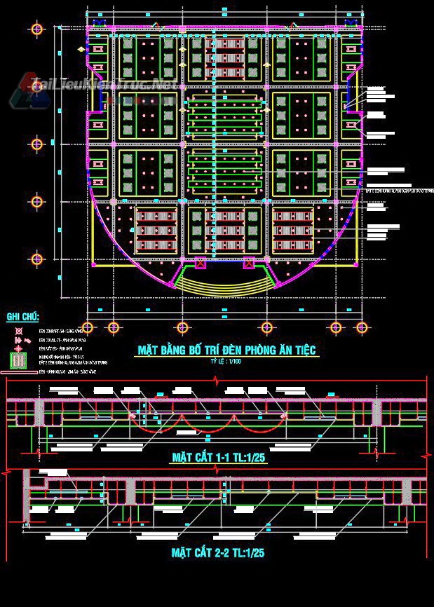 Bố trí ánh sáng: Bản vẽ mặt bằng đèn khu vực phòng ăn tiệc với các kịch bản chiếu sáng hiện đại.