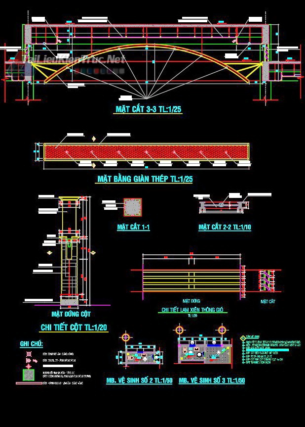 Chi tiết cấu tạo: Các chi tiết cột, giàn thép, hệ thống lam chắn nắng và vệ sinh.