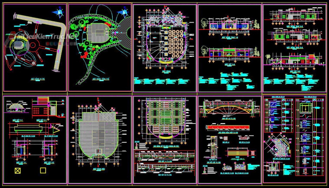 Đây là bộ bản vẽ kỹ thuật thi công phần kiến trúc của một công trình quán cafe có quy mô vừa và lớn, tích hợp không gian sân vườn và giải pháp mái vòm độc đáo.